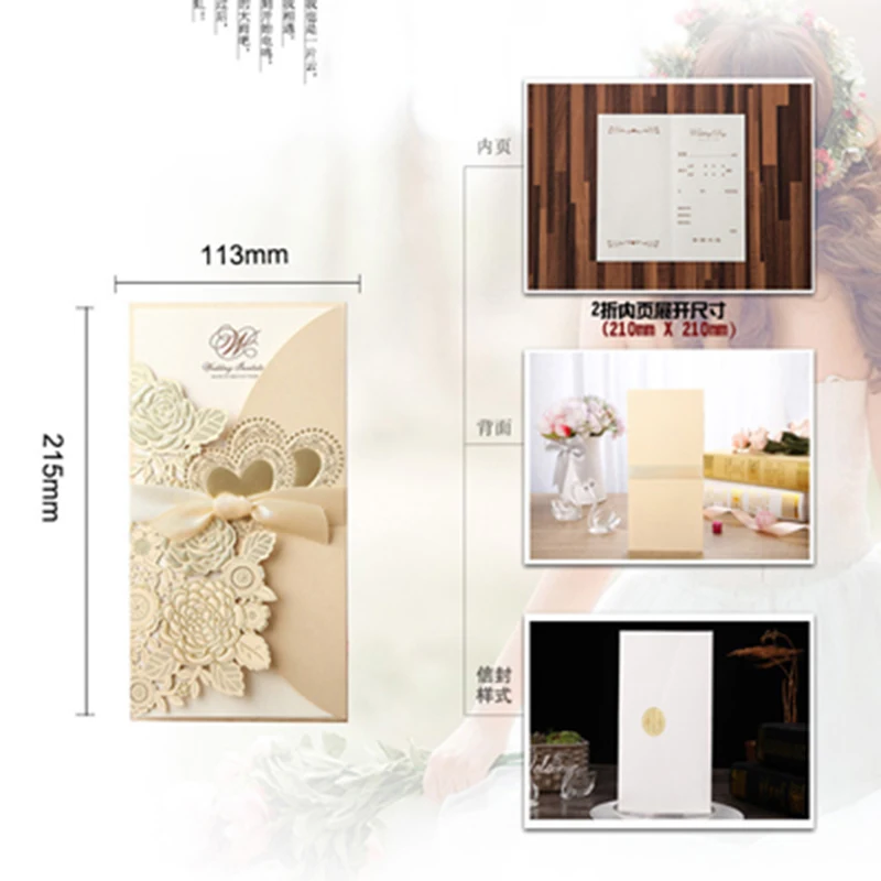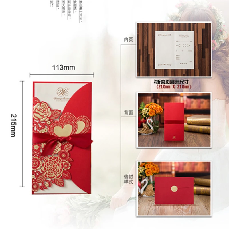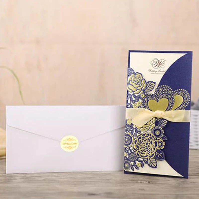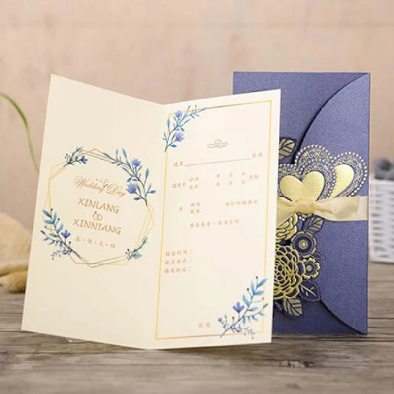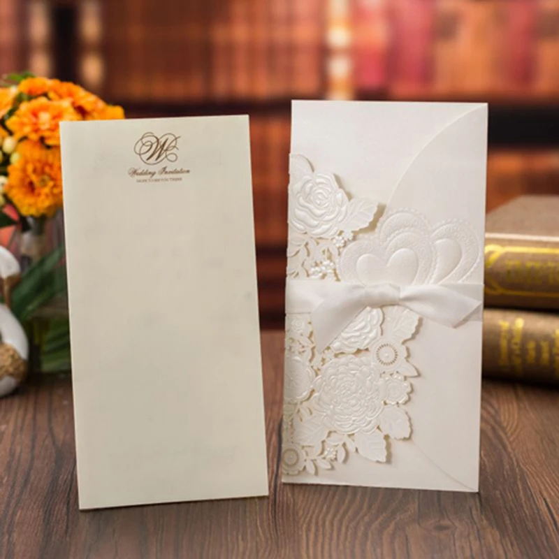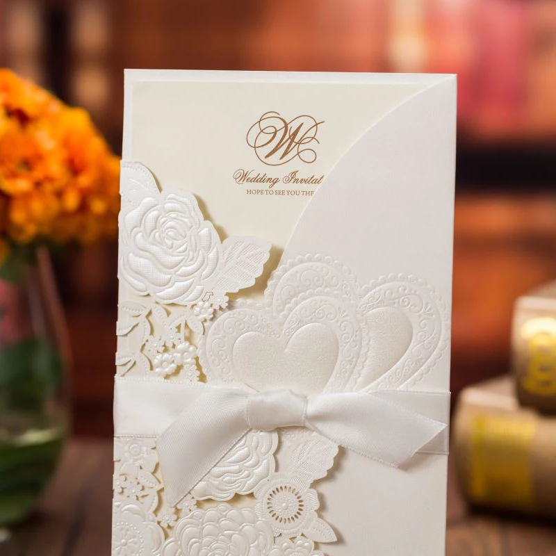 50 шт., лазерная резка, свадебные приглашения, открытки, розовое сердце, открытки на заказ, конверты с лентой, Свадебные вечерние принадлежности