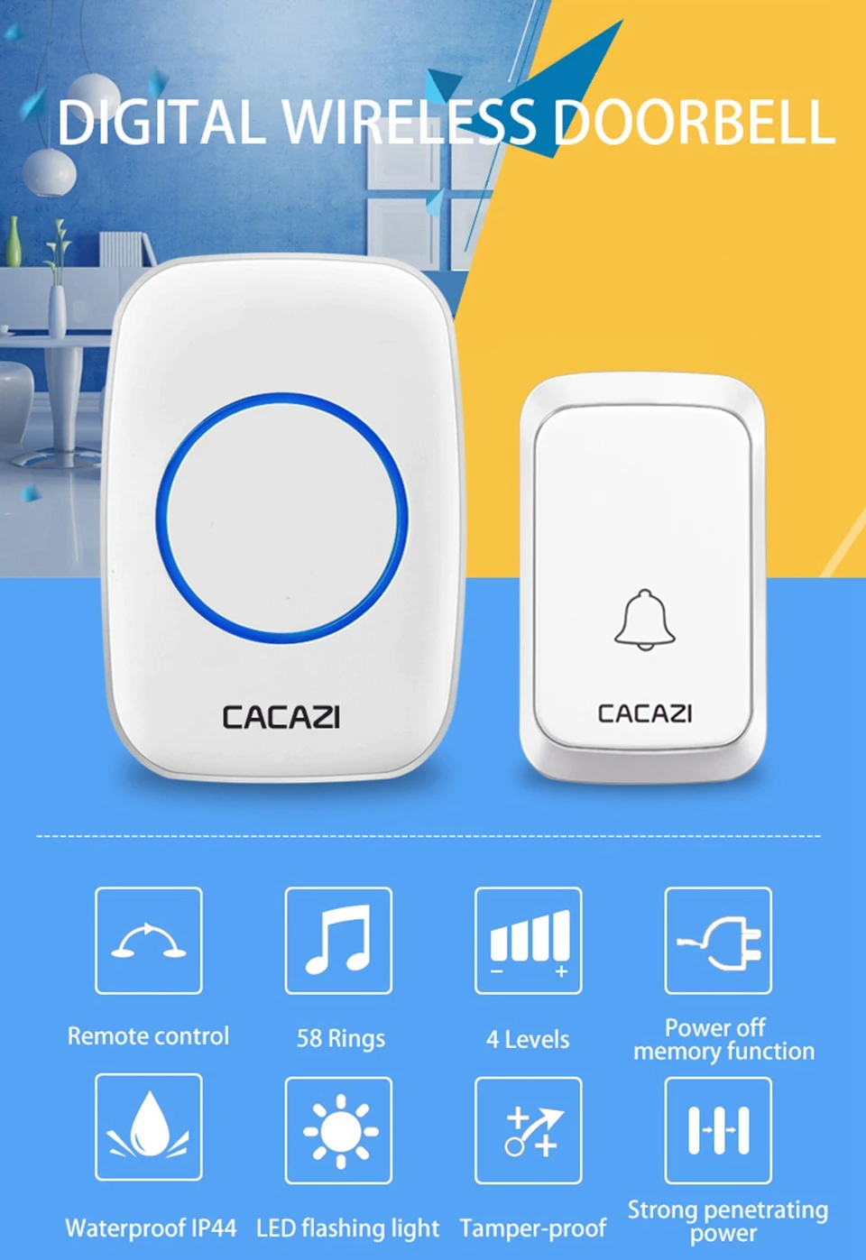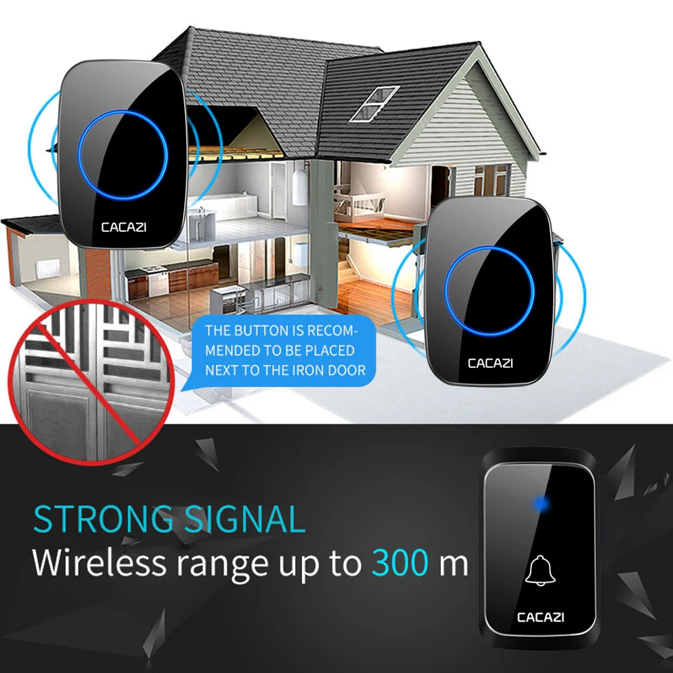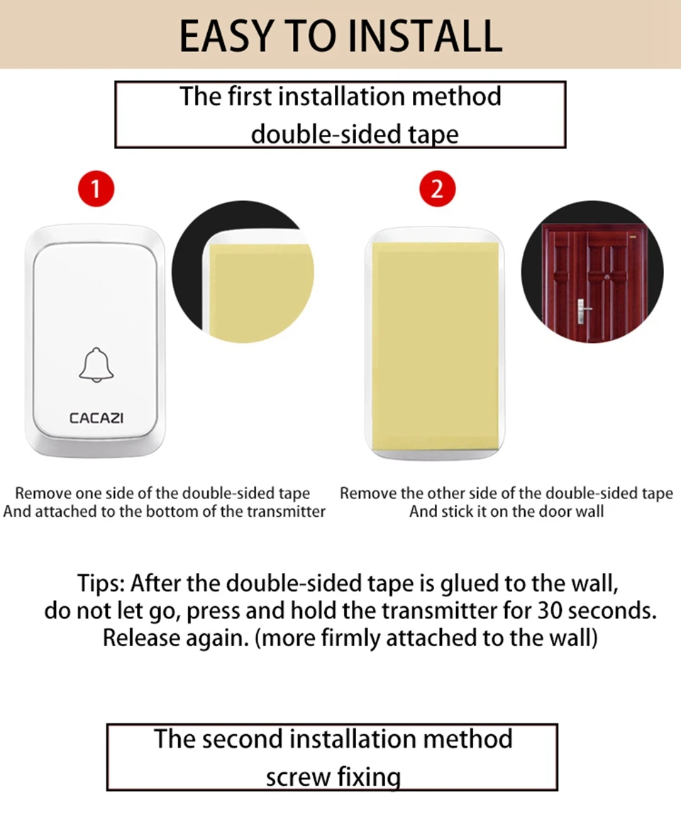 1. Нажмите кнопку, супер обучающий код может свободно научиться сочетать, может быть неограниченным подходящим приемником и кнопкой. 2. Если несколько кнопок соединены с одним или несколькими приемниками в одной системе, каждая кнопка может быть установлена на другой мелодии звонка. 3. Функция отключения памяти: Включите питание снова после выключения питания, не нужно повторно регулировать и блокировать мелодию звонка. 4. Передатчик без винтового патрона обеспечивает водонепроницаемость и защиту от пыли. 5. Передатчик использует щелочную батарею 23A12V (не входит в комплект). 6. Напряжение приемника: 110-220-240в. 7. Приемник доступен в различных вилках, штепсельных вилках США/ЕС/Великобритании и адаптерах Австралии, подходит для большинства стран. 8. Расстояние приема: 300 метров на открытой местности. 9. На беспроводной сигнал будут влиять препятствия. Чем больше препятствий, тем серьезнее потеря сигнала. 10. Приемник имеет 4 уровня (можно отключить звук) 20-80 дБ, 60 музыки на выбор. 11. Размер передатчика: 77*46*20 мм 12. Размер приемника: 95*65*24 мм 13. Просто подключите приемник к электрической розетке, передатчик кнопки может быть приклеен к двери с помощью прилагаемых клейких лент. Примечание: Кнопка не может быть размещена на железной двери, потому что это будет мешать сигналу. Если приемник не звонит, когда вы нажимаете кнопку после получения дверного звонка, пожалуйста, проверьте шаги: 1. Пожалуйста, подтвердите, установлена ли кнопка щелочная батарея 23A12V. 2. Пожалуйста, повторите сопряжение дверных колоколов.