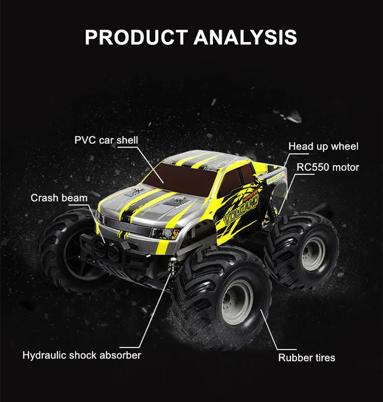 Название продукта: бурный снеговик Продукт: 1:10 Цвет изделия: желтый/красный Размер продукта: 49,5x35,5x21,5 см (1 дюйм ≈ 2,4 см) Расстояние между осями: 27 см Диаметр колеса: 13,5 см Высота шасси: 7 см Частота: 2,4 ГГц Двигатель: RC 550 высокая скорость Рулевая передача: 5 проводов ESC: Водонепроницаемый Скорость: 50 км/ч Удаленное Расстояние: > 100 м Срок службы: ≥ 20 минут Время зарядки: 360 минут Батарея Емкость: 7,2 V 2000mAH Пульт дистанционного управления батареи: 1,5 V "AA" x2 (к товару не прилагаются) Материал изделия: сплав, пластик, резина, электронные компоненты Характеристики продукта: высокая скорость, подъем, вперед, назад, поворот налево, поворот направо Конфигурация продукта: 2,4 ГГц \ 5-проводной высокоскоростного рулевого управления мини-фотолаборатория gear (6 кг Крутящий момент) \ Водонепроницаемая интегрированная защита ESC \ зарядка \ защита от захвата двигателя \ функция отключения питания низкого напряжения \ металлический дифференциальный \ полностью подшипники транспортного средства \ независимая подвеска \ независимый амортизатор удара Посылка включает в себя: 1 х RC автомобиль 1 х пульт дистанционного управления 1 x Батарея 1 x Зарядное устройство Руководство пользователя-1 шт.;