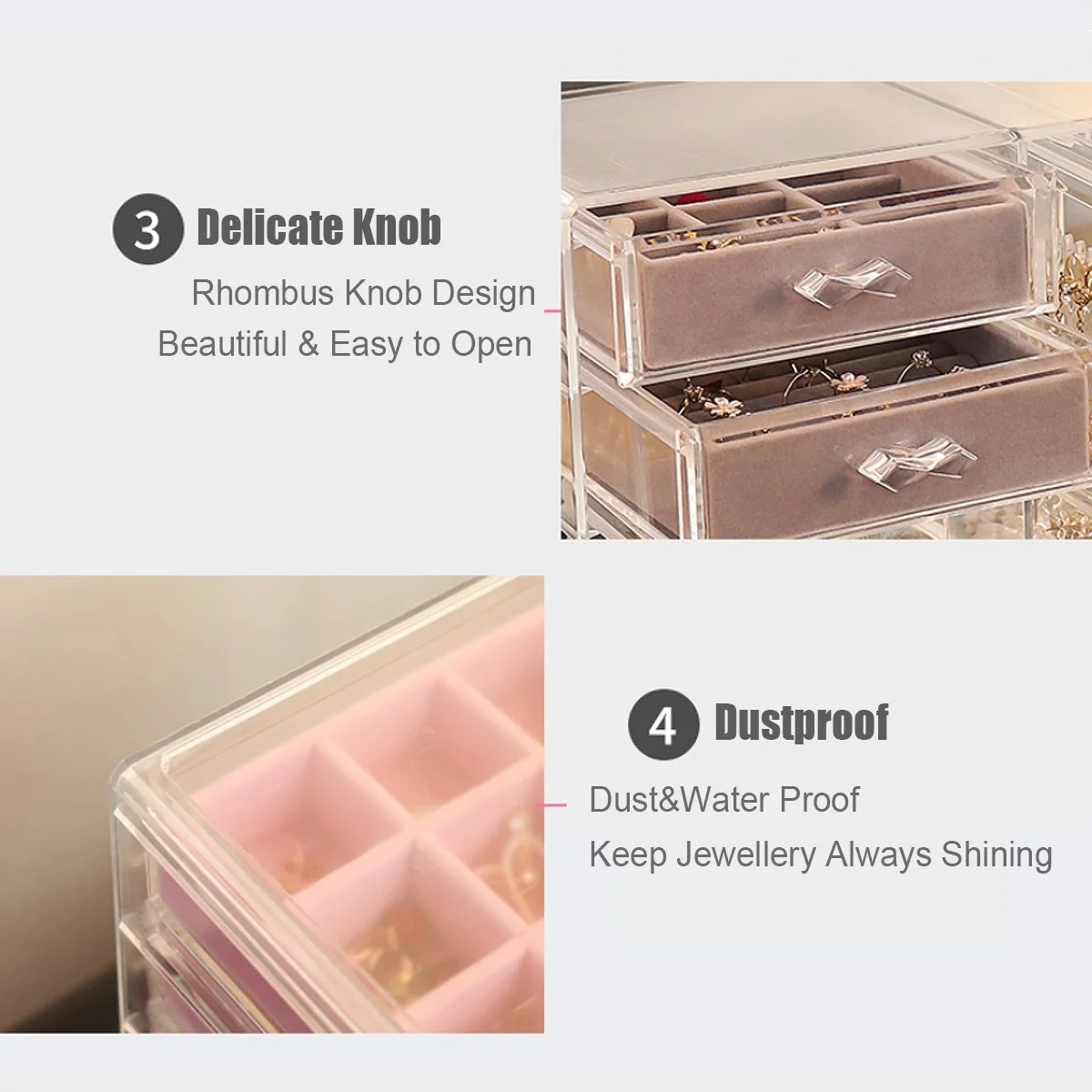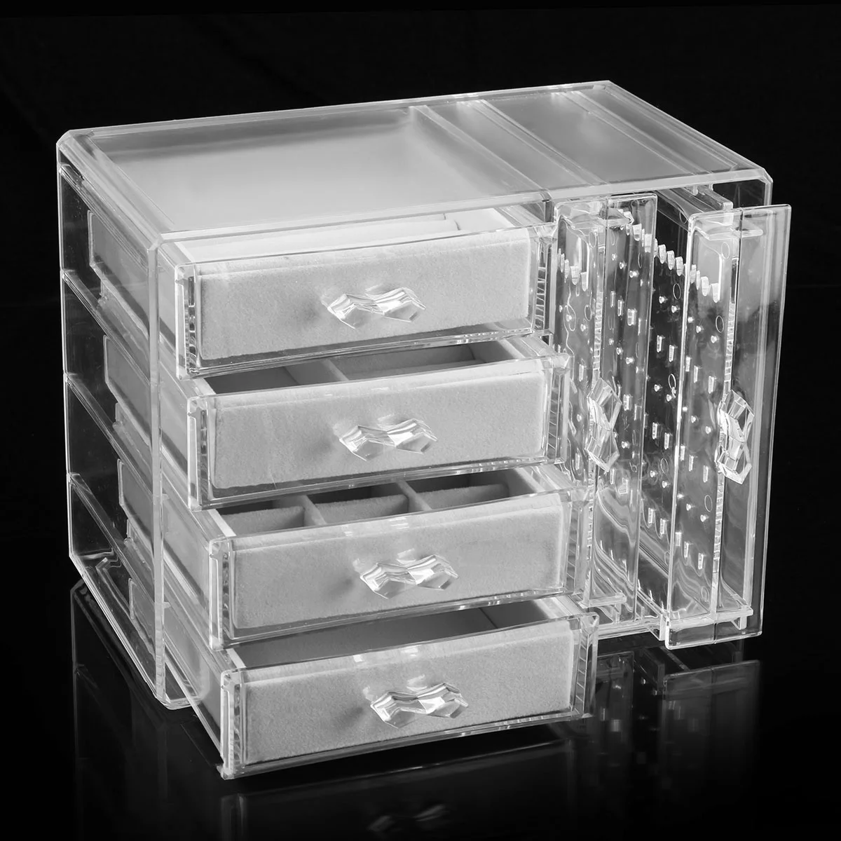 Ювелирные изделия не входят в комплект Технические характеристики: Название продукта: акриловый Органайзер для хранения ювелирных изделий Материал: акриловое волокно Использование: серьги для хранения ювелирных изделий Цвет: (опционально) Серый/розовый/бежевый бархат 4 ящика и 2 лотка