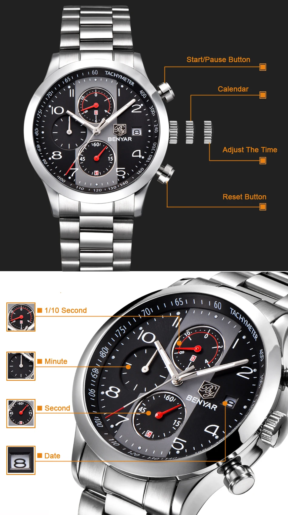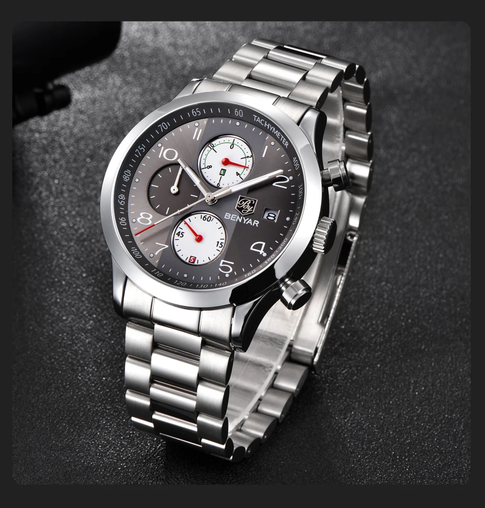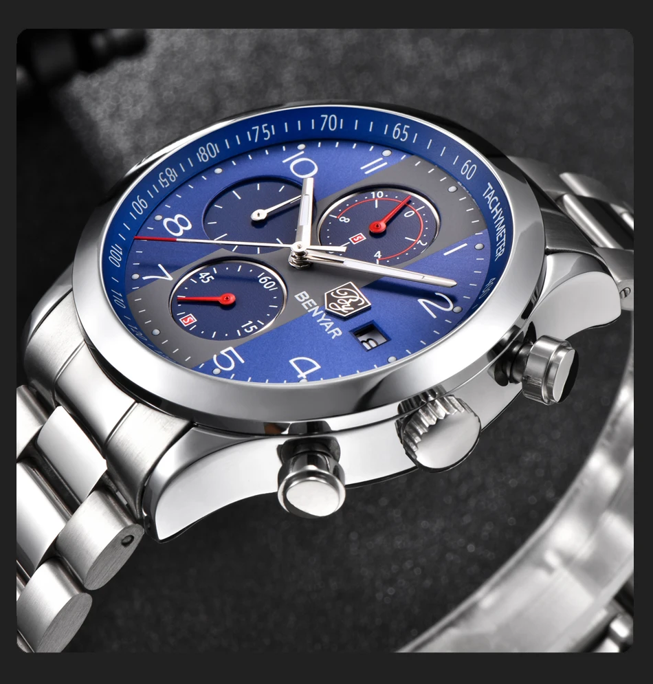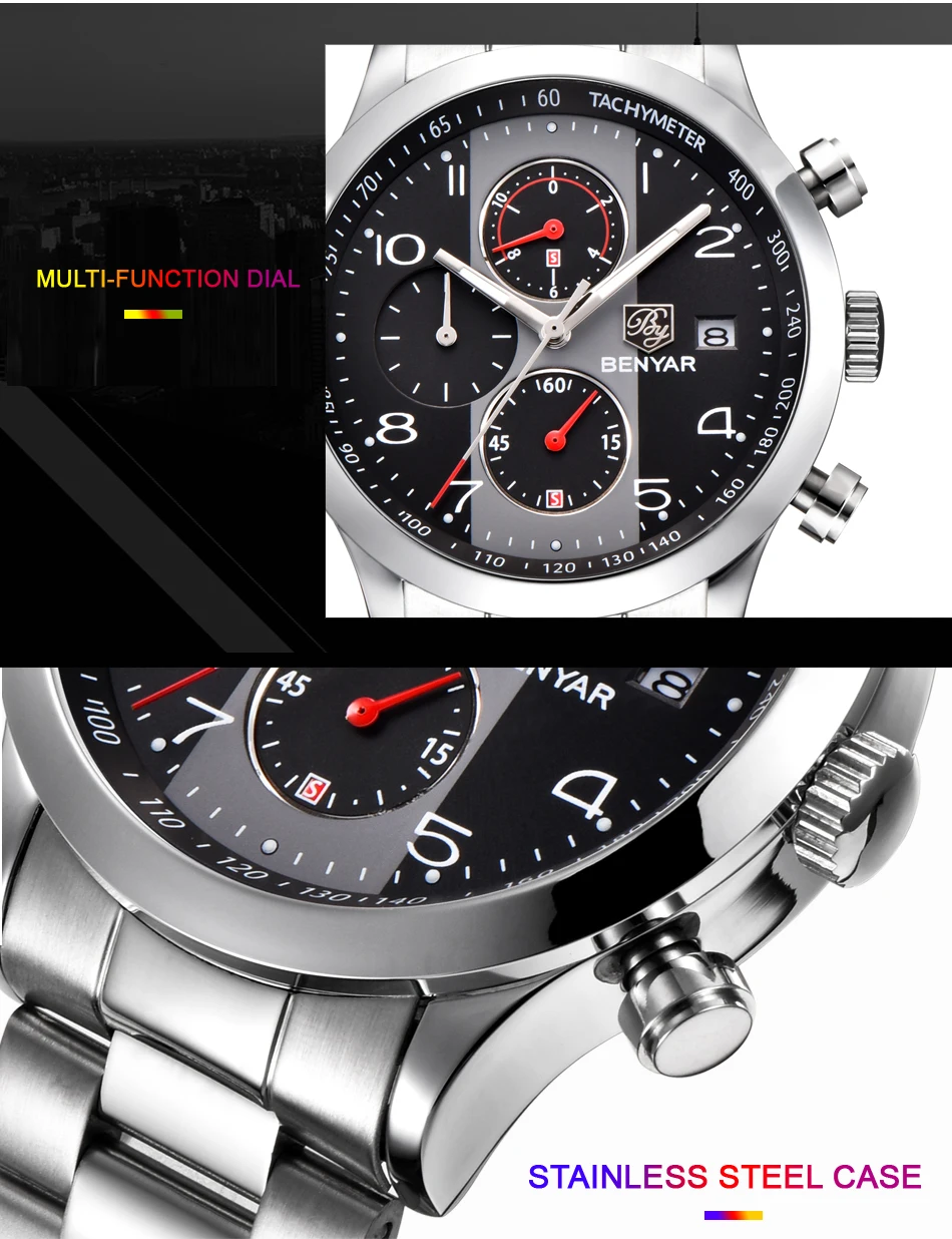 BENYAR часы мужские модные Хронограф Спортивные ремешок из нержавеющей стали брендовые кварцевые часы Relogio Masculino Reloj Hombre черный