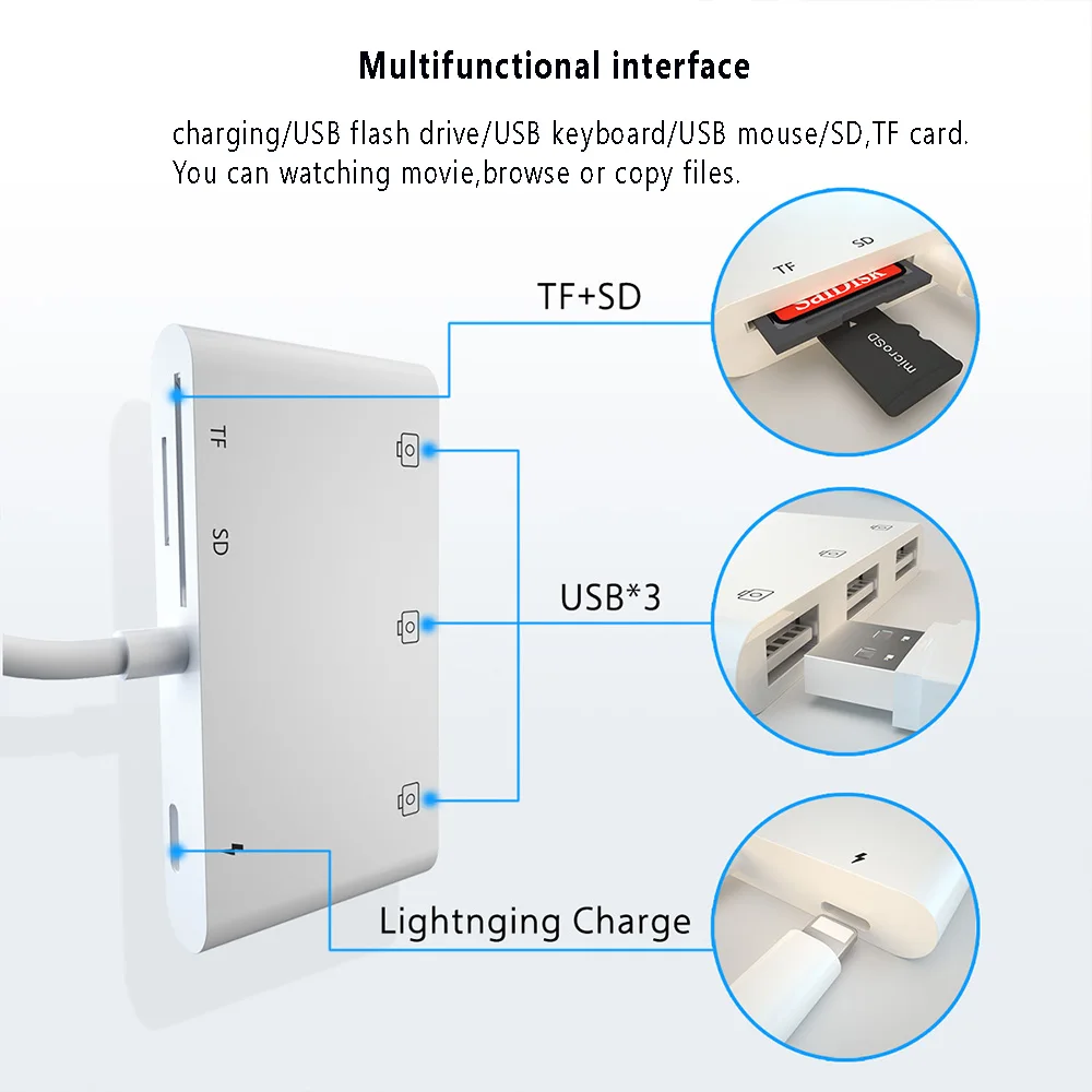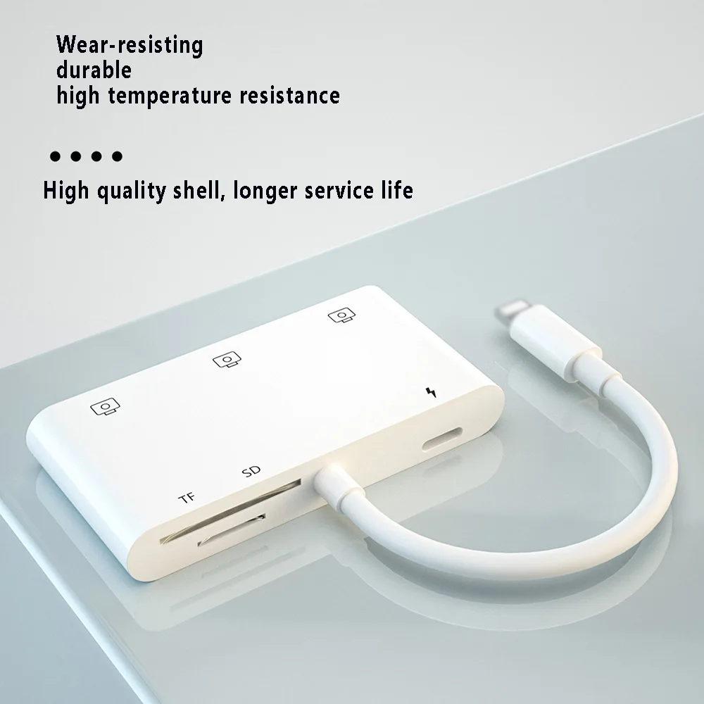 Подходит для подключения Lightning к камере, картридер 4 в 1 4 в 1 для I продуктов Характеристики продукта: 1. Система iOS поддерживает прямой импорт и экспорт фотографий и видео на sd-карте, tf-карте, usb-диске (Двусторонняя передача); 2. Интерфейс USB поддерживает usb-устройства, такие как usb-мышь/usb-клавиатура/беспроводная сетевая карта/usb-гарнитура/звуковая карта/концентратор; 3. Порт Lightning предназначен только для зарядки и может использоваться с другими портами; 4. Поддержка новейшей системы iOS13/OS13 для поддержки работы мыши, чтения файлов слова/Excel/PDF и т. Д. Цвет: белый Примечание: жесткий диск не работает. Характеристики продукта: Plug and play, без приложения, оригинальный чип, поддержка обновления Подходит для iPhone11/ X/iPhone 8/8plus/iPhone 7/7plus /iPad 4