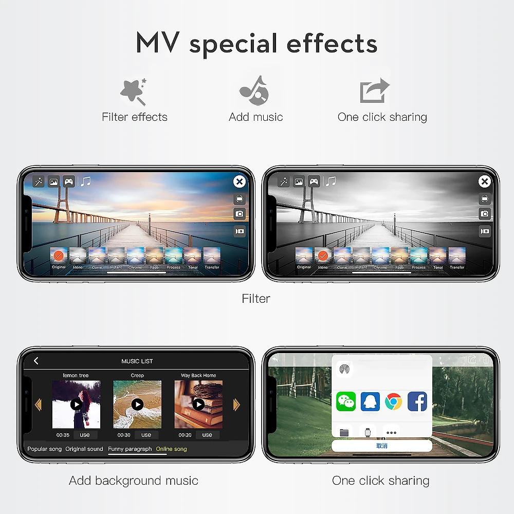 MV EDITION-существует несколько эффектов фильтра на интерфейсе приложения на ваш выбор. Вы можете добавить популярную фоновую музику и создать замечательное музыкальное видео. Поделиться на сайте социальной сети.