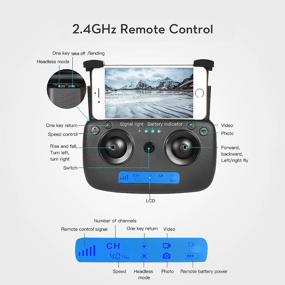 Функция: вверх/вниз, поворот влево/вправо, вперед/назад, боковой полет, Wi-Fi соединение, двойная камера, режим следования, оптическое положение потока, возврат одной кнопкой, один ключ для land/take off, режим траектории полета, переключение скорости, видео жестов, фото жестов, производство мВ, 3 режима управления, включая режим джойстика, Классический режим и режим обнаружения движения, поиск дрона.