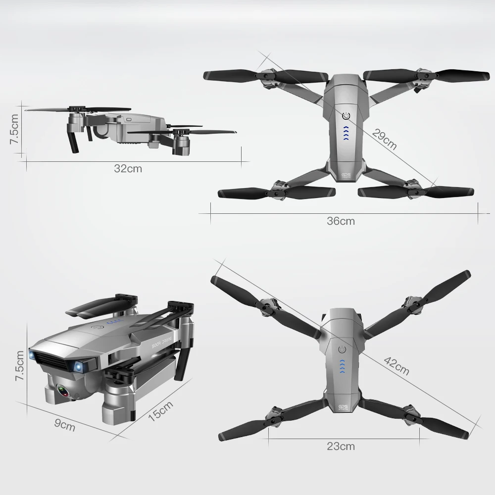 Размер дрона: 36*32*7,5 см (разворачивается); 15*9*7,5 см (складывается)