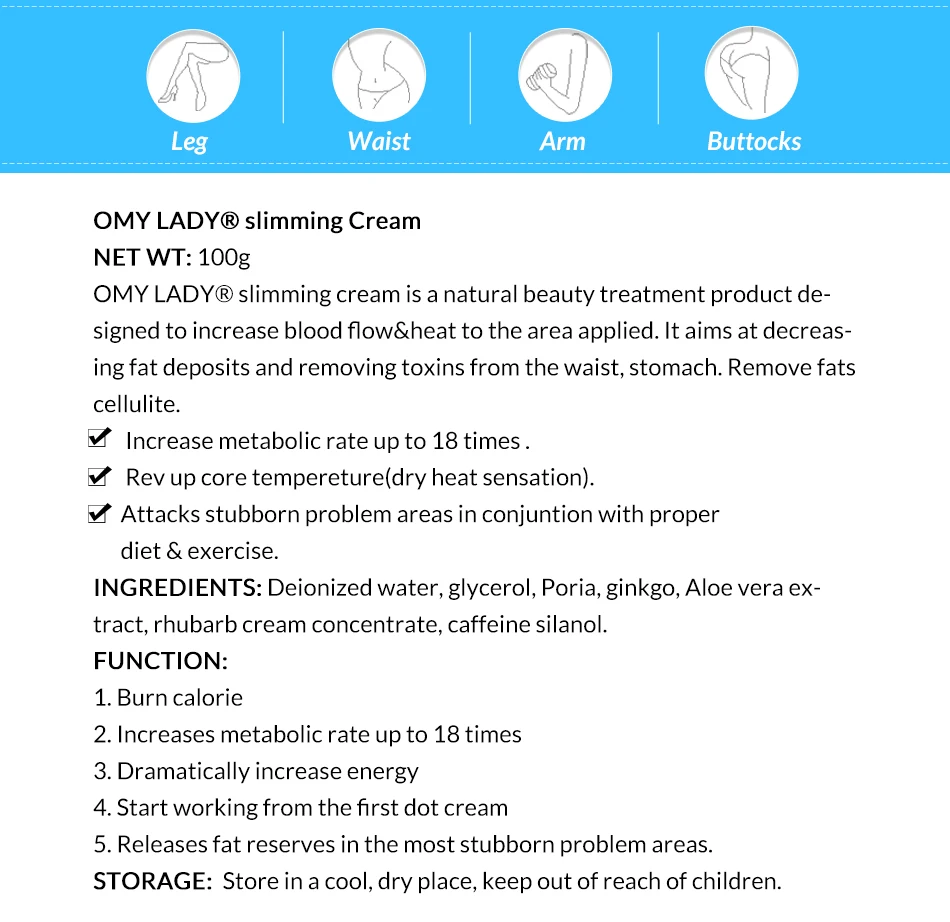 ★Крем для похудения OMY LADY ▶Вес нетто: 100 г ▶Крем для похудения OMY LADY является естественным косметическим средством, предназначенным для увеличения кровотока и тепла в области применения. Он нацелен на уменьшение жировых отложений и удаление токсинов из талии, желудка. Удалите жир от шеллюлита. ☑Скорость метаболизма lncrease до 18 раз. ☑Закалённая сердцевина Rev up (сенсация сухого тепла). ☑Атакует упорные проблемные зоны в conjuntion с правильной диетой и упражнениями. ▶Метод использования 1. Нанесите соответствующее количество на кожу равномерно и массируйте. Три раза в день. 2. После использования крема с пластиковой пленкой на коже. Лучше делать упражнения после использования крема. Примечание: Не для беременных или кормящих грудью женщин, сердечно-сосудистых заболеваний и больных инсультом.