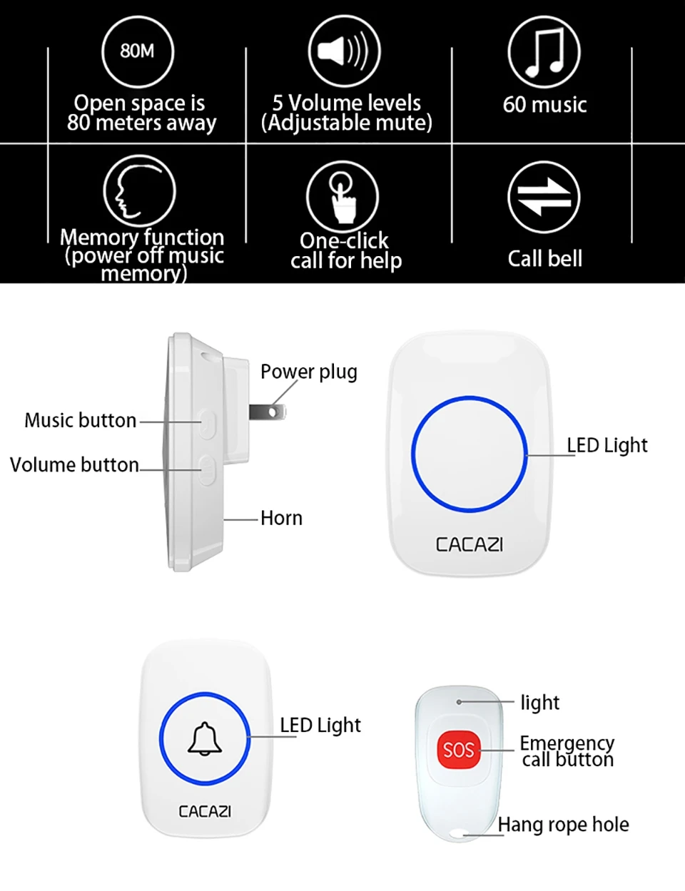 1. Кнопка поддерживает до 20 шт., а приемник поддерживает до 100 шт. 2. Если несколько кнопок сопряжены с одним или несколькими приемниками в одной системе, каждая кнопка может быть настроена на другой рингтон. (эта функция поддерживает кнопку sos.) 3. Функция отключения питания: Включите питание снова после выключения питания, нет необходимости повторно настраивать и блокировать мелодию звонка. (эта функция поддерживает кнопку sos.) 4. Передатчик дверного звонка и кнопка sos не имеют винтового патрона, он может быть водонепроницаемым и пыленепроницаемым без резинового кольца. 5. Кнопка sos использует батарейку CR2032. (батарейка в комплект не входит). 6. Напряжение приемника: 110-220-240в. 7. Приемник доступен в различных вилках, вилках стандарта США/ЕС/Великобритании и адаптерах Австралии, подходящих для большинства стран. 8. Расстояние приема дверного звонка: 80 метров на открытой местности. 9. Препятствия влияют на беспроводной сигнал. Чем больше препятствий, тем серьезнее потеря сигнала. 10. Приемник имеет 5 уровней (можно отключить звук) 0-110 дБ, 60 музыки на выбор. 11. Размер: Кнопка SOS: 60x34x11,5 мм, Приемник: 95x65x24мм. Примечание: кнопку нельзя разместить на железной двери, так как это помешает передаче сигнала.