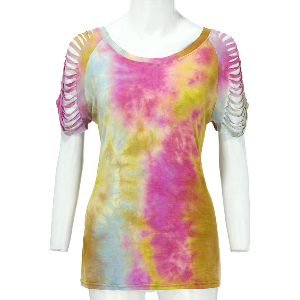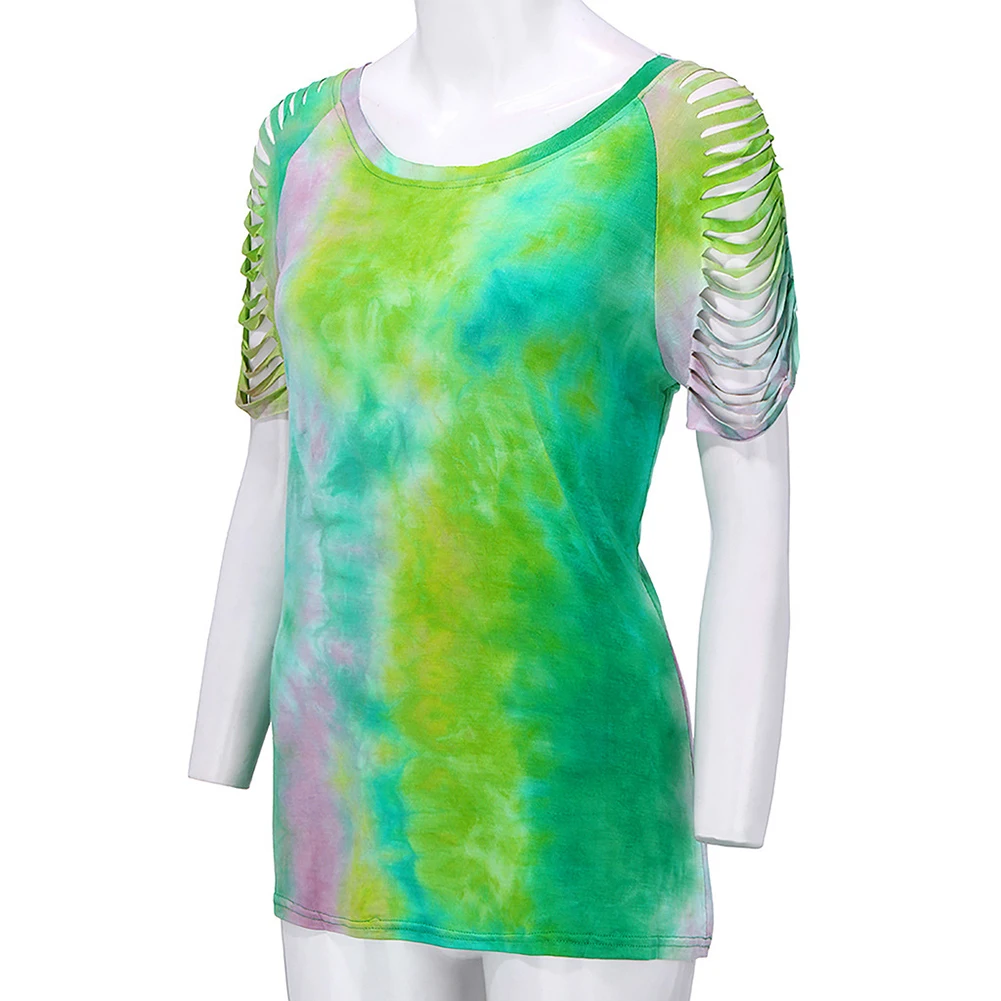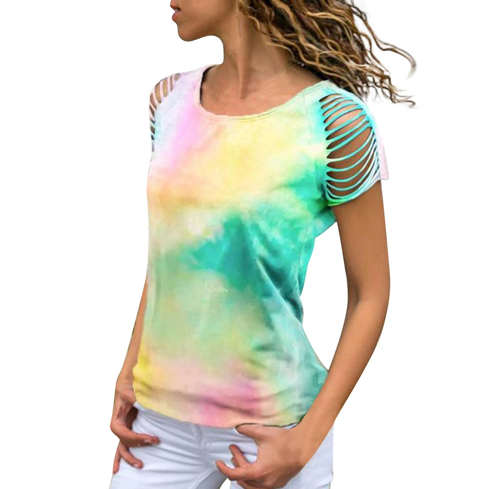 Модные летние женские галстук-Краска Круглый вырез кисточки короткий рукав блузка Футболка Топ
