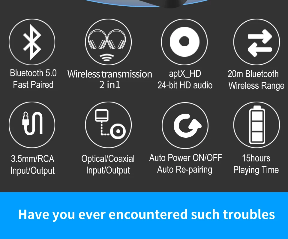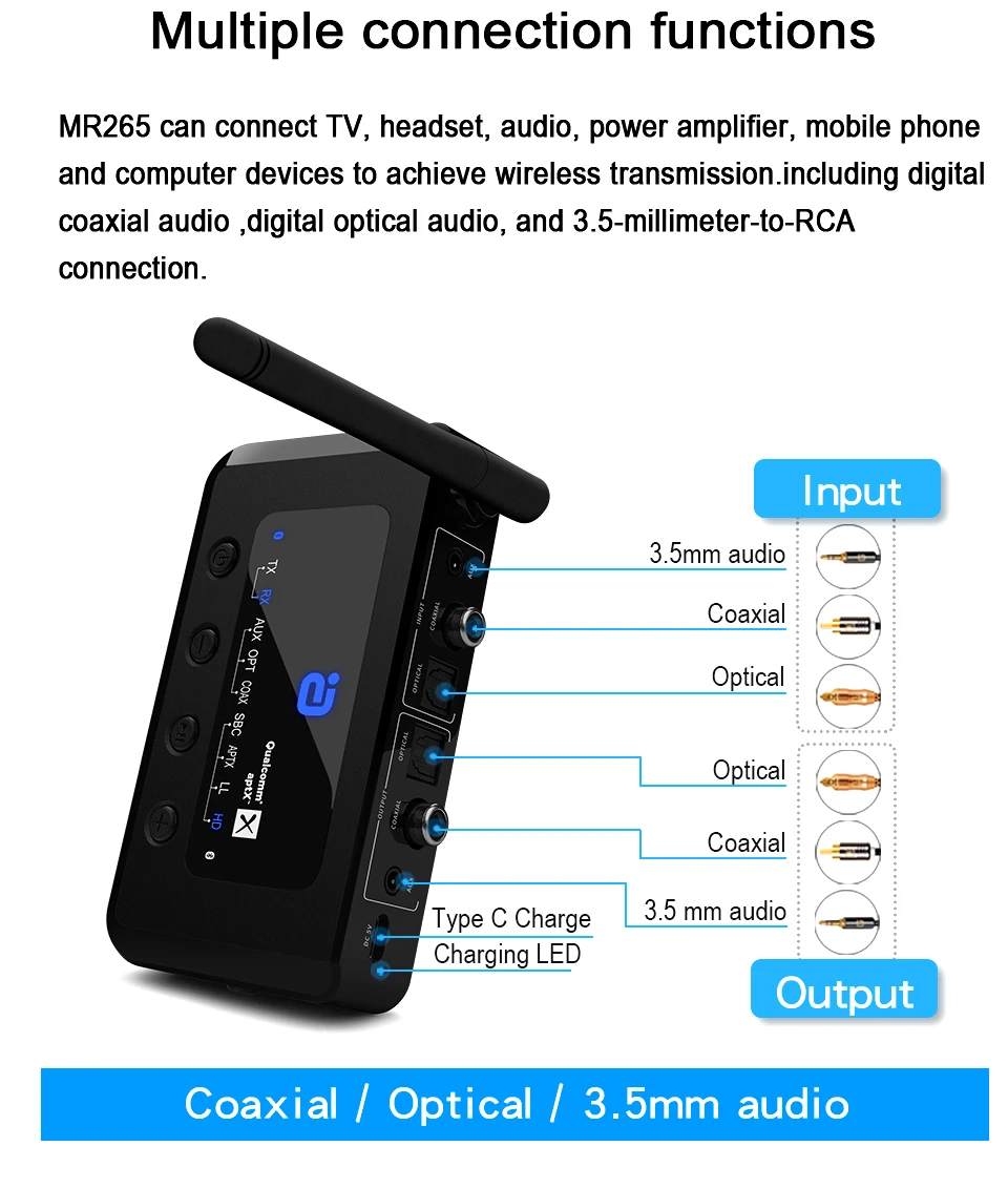 【 15-часовое длительное время работы в режиме ожидания 】 Встроенный мощный аккумулятор емкостью 400 мА · ч, он обеспечит 15 часов за одну зарядку, вы также можете использовать его во время зарядки. Поддерживает как RCA/3,5 мм aux аудио подключение цифровой/оптический аудио вход и выход, он совместим практически со всеми устройствами.