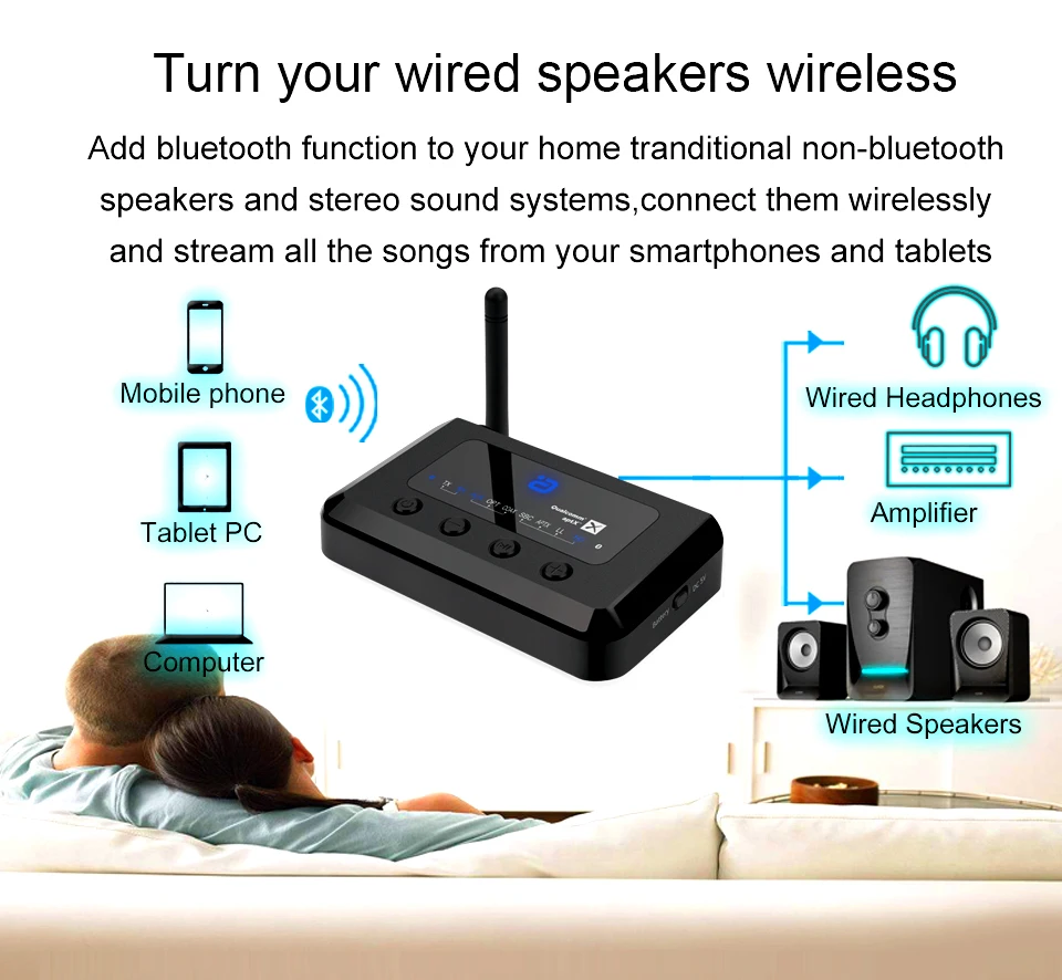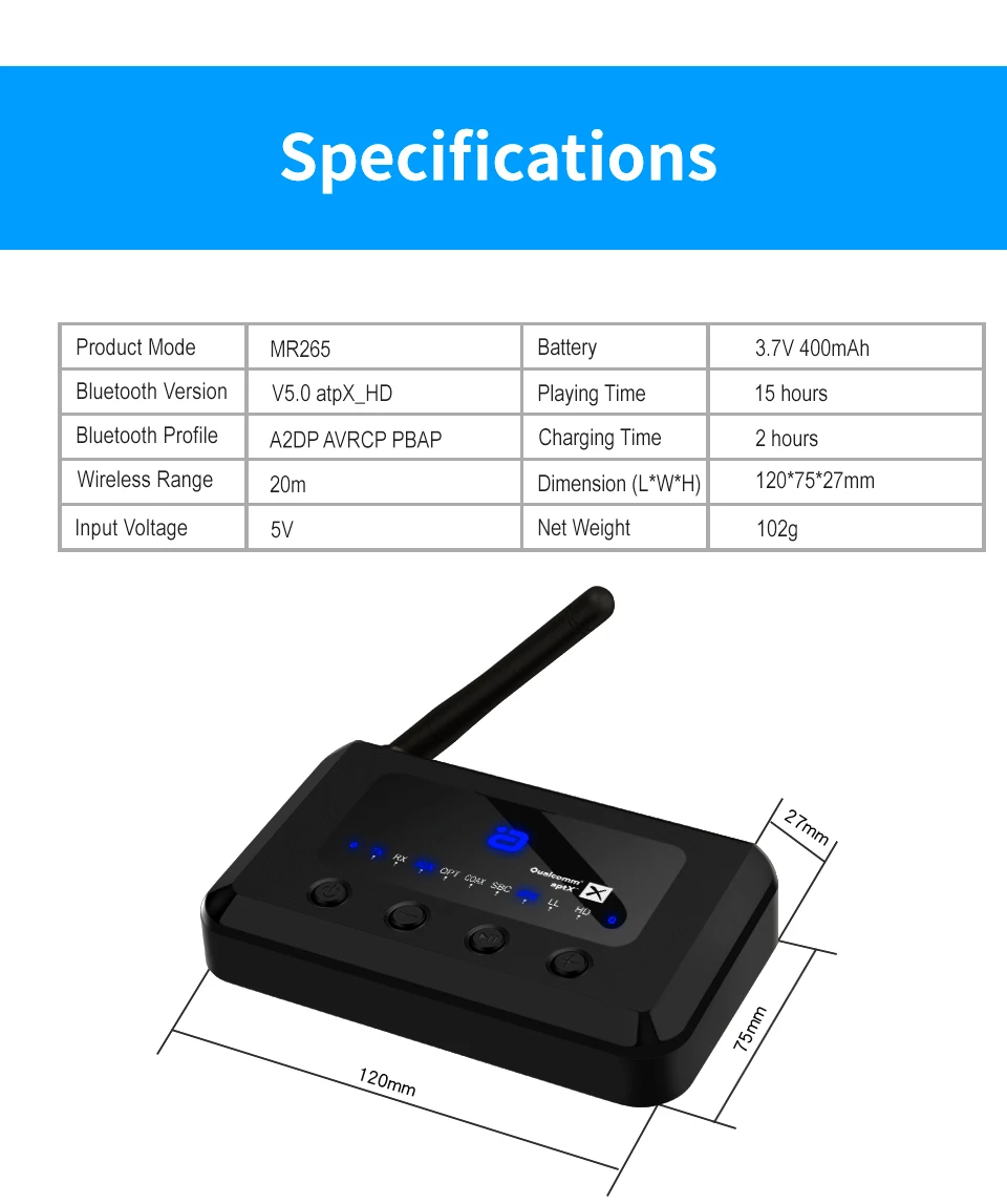 【BLUETOOTH 5,0 Hi-Fi Aptx HD/ll】 оснащен самой высокой версией Bluetooth V5.0 и высококлассным чипом CSR8675, чтобы обеспечить лучшую эффективность передачи, стабильность и сверхнизкое энергопотребление. Поддержка AptX HD и AptX с низкой задержкой, высокая точность CD качество стерео звуковых потоков плавно. Это лучший выбор, если вы ищете экономически эффективный bluetooth-аудио приемник и передатчик.