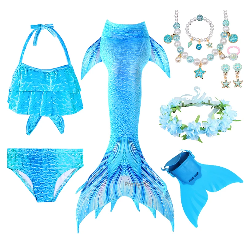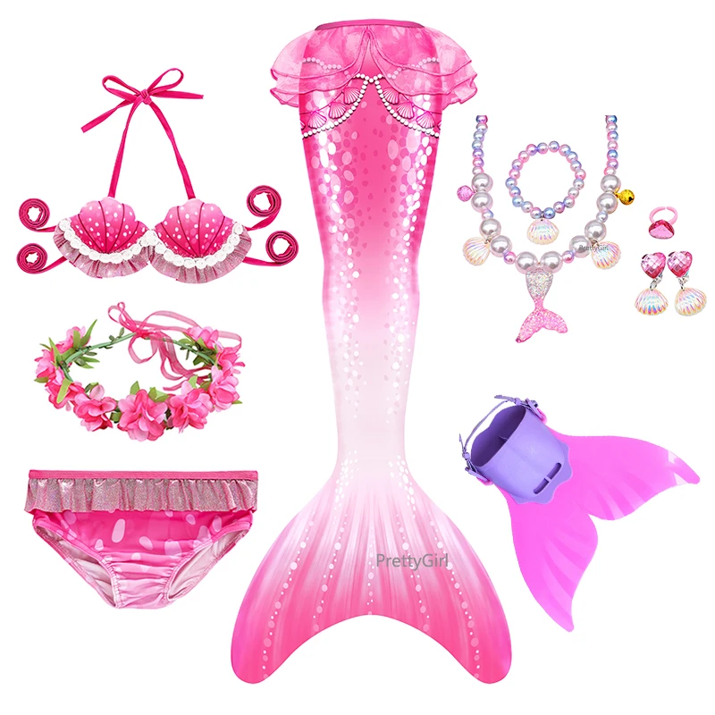 10 шт.: 1 * платье с хвостом русалки + 1 * бюстгальтер + 1 * шорты + 1 * гирлянда + 1 * ластик монофин + 1 * ожерелье + 1 * браслет + 1 * кольцо + 1 пара зажимов для ушей