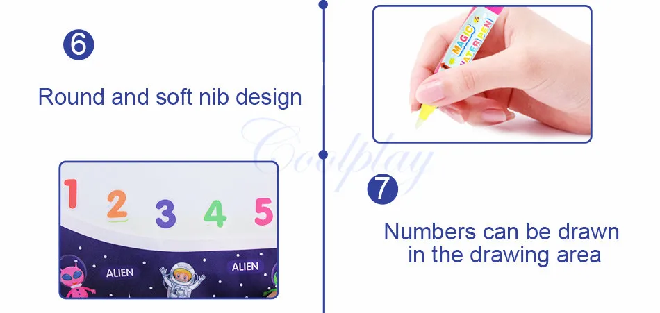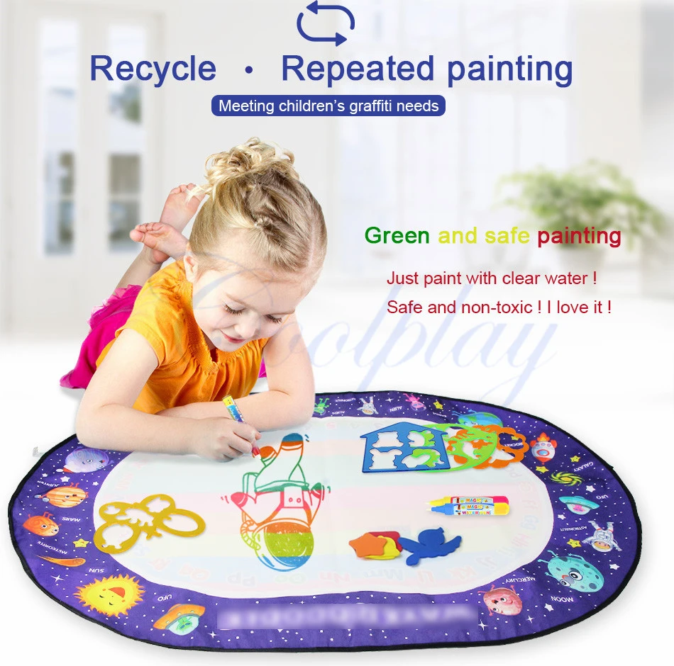 -Его коврик будет создавать сказочные каракули. -Не нужно никаких чернил, просто используйте волшебную ручку, наполненную чистой водой и создайте на волшебном коврике. -Дети будут очарованы тем, что яркие изображения будут подсвечиваться и медленно исчезать, чтобы дети могли использовать коврик снова и снова. -Лучший подарок для ваших детей!