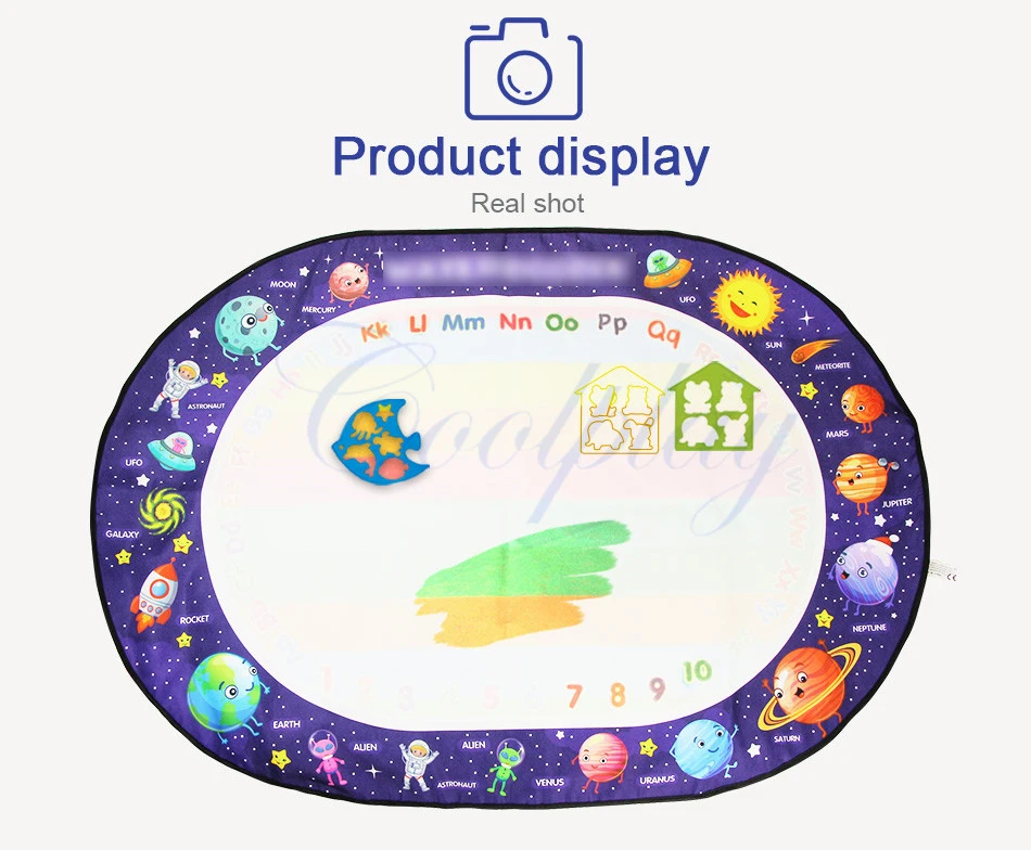 1. Коврик сделан из высококачественной и экологически чистой ткани. 2. Волшебные ручки сделаны из высококачественного хлопка. Они высокой плотности, хорошо впитывают воду и гладкие краски. 3. Чистая вода как чернила-нетоксичные и не загрязняющие окружающую среду, зеленые и здоровые. 4. Цвет на коврике автоматически исчезнет через несколько минут, его можно использовать повторно. 5. Тщательная работа, прекрасные детали. Строгая технология шитья уделяет больше внимания созданию каждой детали проводки. Аккуратный процесс обрезки делает холст воды более заметным, прочным и практичным. 6. Различные аксессуары могут удовлетворить потребности ребенка в живописи и развивать их воображение. 7. Мягкий и складной материал, легко носить с собой и упаковывать.