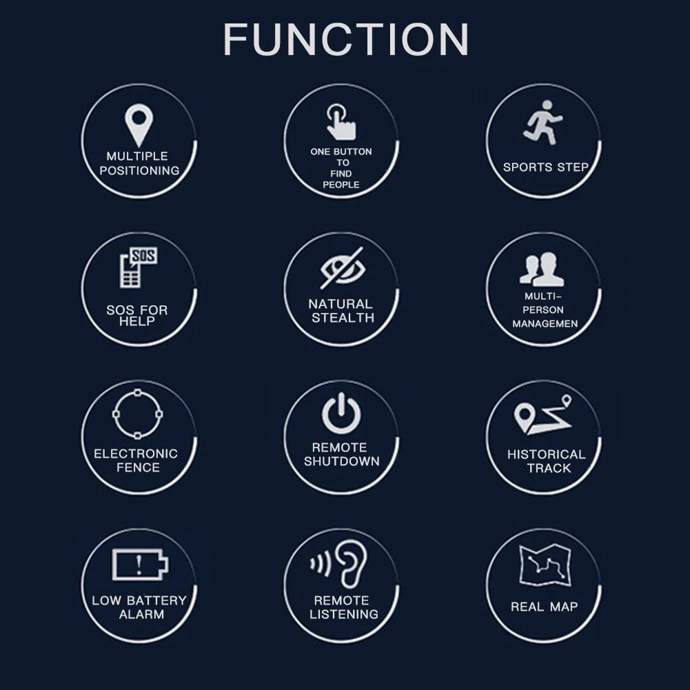 * 6. Функция: несколько позиционирования, одна кнопка для поиска людей, спортивный шаг, SPS для помощи, естественная Скрытность, Управление несколькими лицами, электронный забор, удаленное отключение, историческая дорожка, сигнализация низкого заряда батареи, дистанционное прослушивание, реальная карта