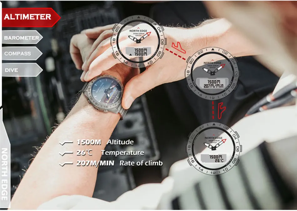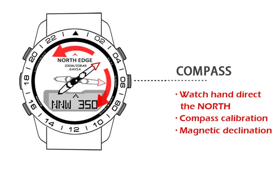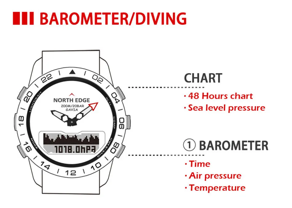Альтиметр/барометр/Компас/дайвинг/водонепроницаемый 200 м/Двойное время/отсчет/калории/Будильник времени/температура/подсветка/напоминание о низкой мощности/шагомер/Устойчивость к низкой температуре