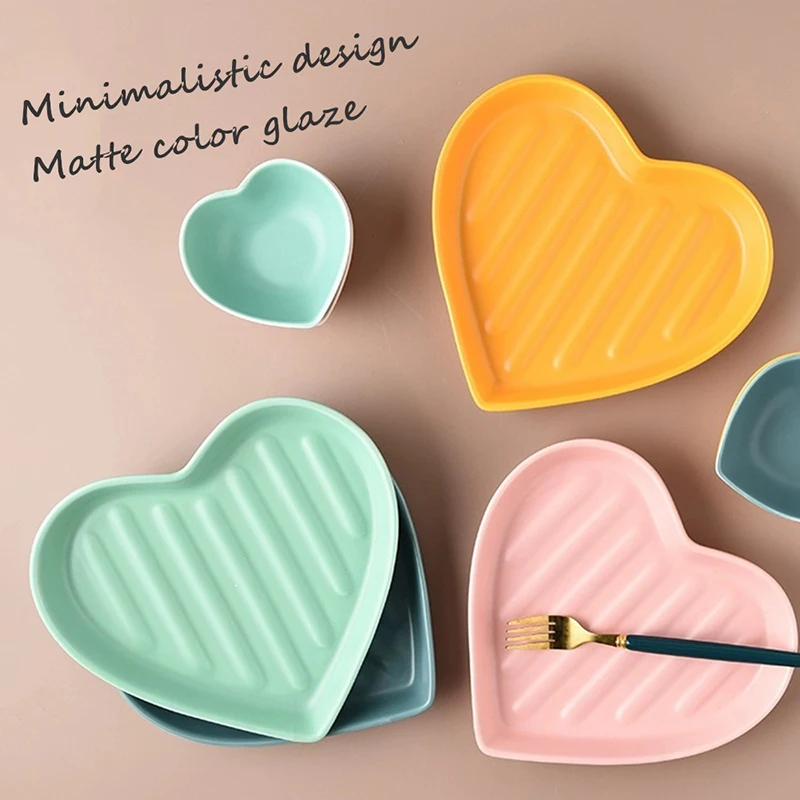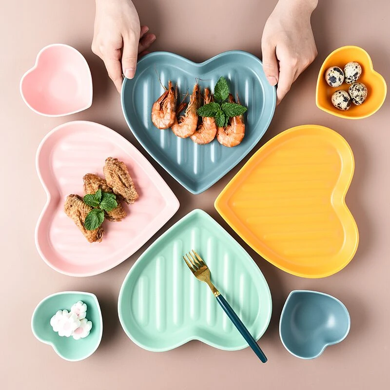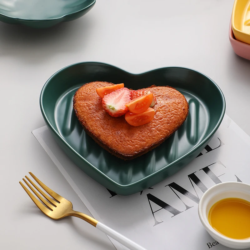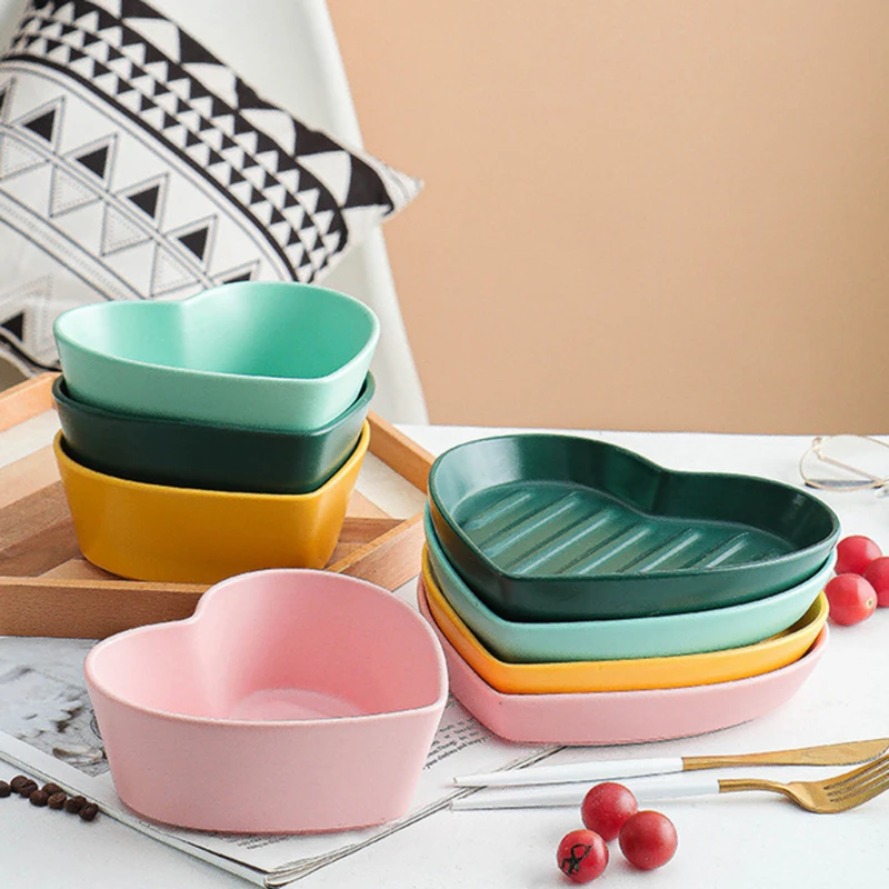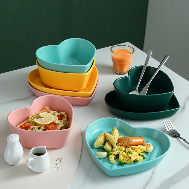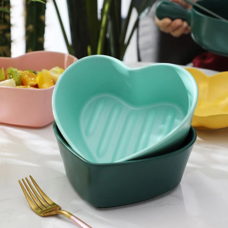 Европейская посуда в форме сердца Материал: керамика Процесс: Цветная глазурь Стиль: тарелка в форме сердца/чаша в форме сердца Цвет: розовый/светильник зеленый/желтый/темно-зеленый Область применения: микроволновая печь/посудомоечная машина/духовка/дезинфекционный шкаф