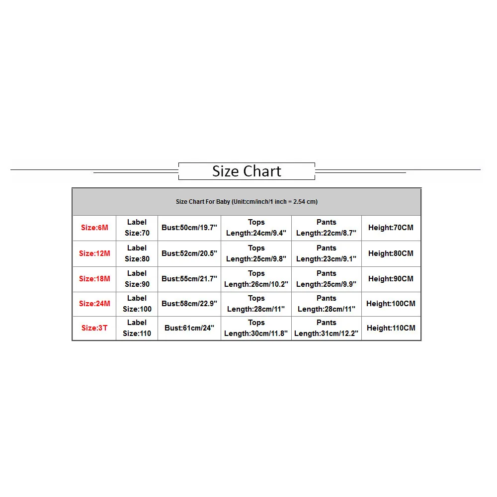 Таблица размеров для ребенка (Единица измерения: см/дюйм/1 дюйм = 2,54 см) Размер:6М Размер этикетки: 70 Бюст: 50 см/19,7" Топы Длина: 24 см/9,4 дюйма Брюки Длина: 22 см/8,7" Высота: 70См Размер:12М Размер этикетки: 80 Бюст: 52 см/20,5" Топы Длина: 25 см/9,8 дюйма Брюки Длина: 23 см/9,1 дюйма Высота: 80См Размер: 18 м Размер этикетки: 90 Бюст: 55 см/21,7" Топы Длина: 26 см/10,2 дюйма Брюки Длина: 25 см/9,9 дюйма Высота: 90См Размер: 24 м Размер этикетки: 100 Бюст: 58 см/22,9" Топы Длина: 28 см/11" Брюки Длина: 28 см/11" Высота: 100См Размер: 3Т Размер этикетки: 110 Бюст: 61 см/24" Топы Длина: 30 см/11,8" Брюки Длина: 31 см/12,2 дюйма Высота: 110См