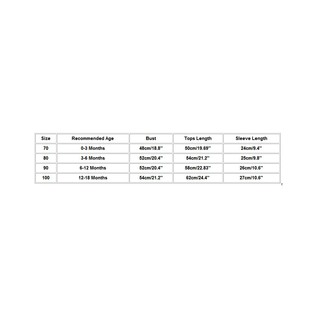 Размер Рекомендуемый возраст Бюст Длина топа Длина рукава 70 0-3 месяца 48 см/18,8'' 50 см/19,69'' 24 см/9,4 дюйма 80 3-6 месяцев 52 см/20,4'' 54 см/21,2'' 25 см/9,8 дюйма 90 6-12 месяцев 52 см/20,4'' 58 см/22,83'' 26 см/10,6'' 100 12-18 месяцев 54 см/21,2'' 62 см/24,4'' 27 см/10,6''