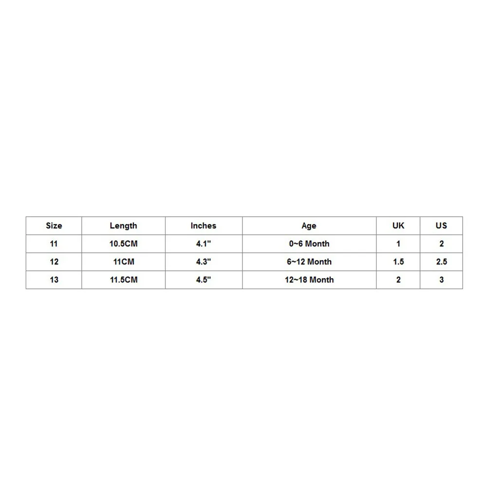 Размеры Длина Дюйм (ов) Возраст Великобритания Свяжитесь с нами 11 10,5 см 4,1" 0-6 месяцев 1 2 12 Высота каблука 11 см 4,3" 6-12 месяцев 1,5 2,5 13 11,5 см 4,5" 12-18 месяцев 2 3