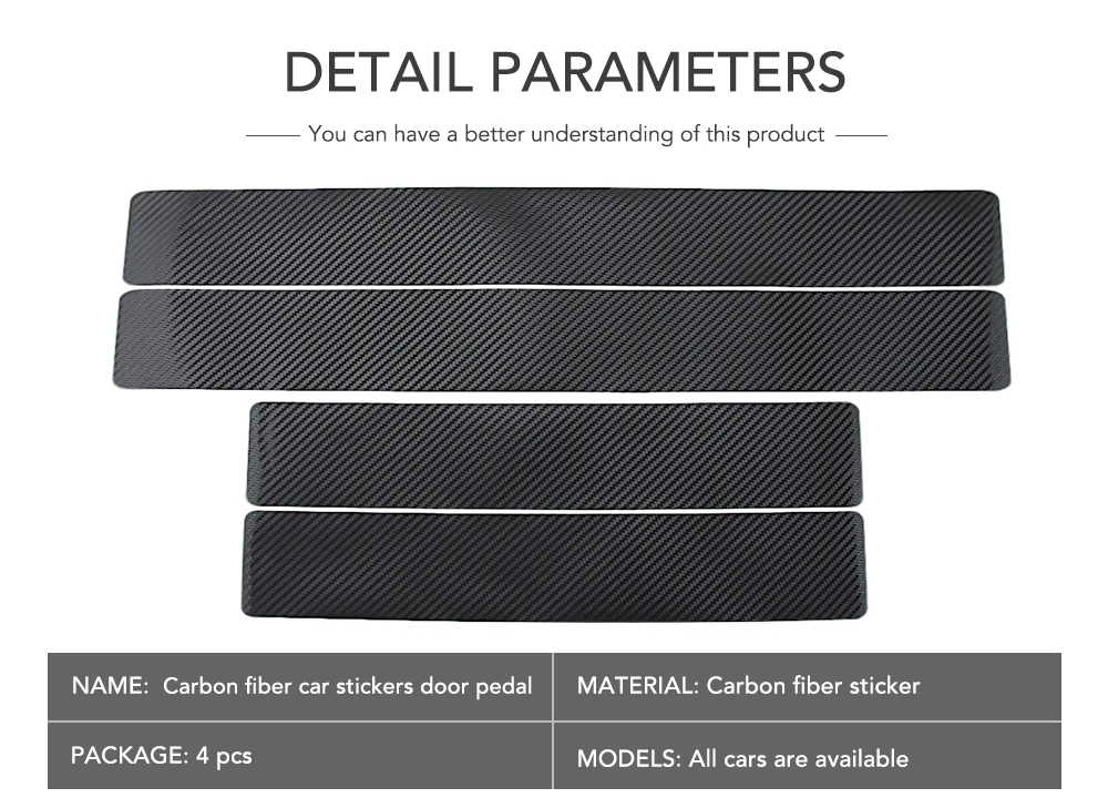 Материал: углеродное волокно 3D Цвет: черный Размер передней наклейки: 60 см x 6,7 см/23,6x2,6 дюйма Размер задней наклейки: 40 см x 6,7 см/15,7x2,6 дюйма Функция: защищает от появления царапин Повод: автомобили Тип товара: защитные наклейки для автомобиля Количество: 1 шт. Особенности: Водонепроницаемый, простой в уходе. Установка Простая, удобная и быстрая. Защитите свой автомобиль, чтобы не поцарапать. Подходит для большинства автомобилей и может быть вырезан. Посылка: 2 Наклейки на переднюю дверь, 2 Наклейки на заднюю дверь Примечание: Из-за разницы между различными мониторами изображение может не отражать фактический цвет изделия.