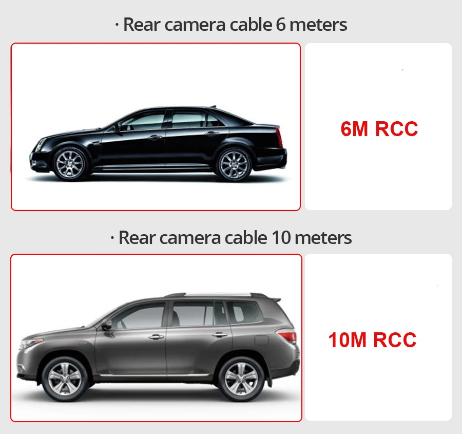 Есть 2 длины задней камеры (до 10 метров) может быть выбран, подходит для автомобилей различной длины. Пожалуйста, выберите заднюю камеру в соответствии с длиной вашего автомобиля.