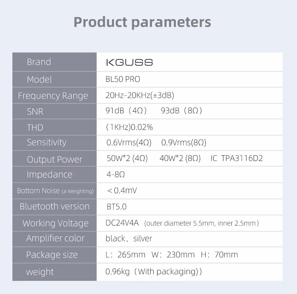 К тому же стандарт 3,5 мм AUX вход переменного тока, он также поддерживает Bluetooth 5,0 для достижения более быстрой и более стабильной скоростью передачи. Совместим с большинством домашних аудиоустройств, таких как iPod, телефон, планшетный ПК, компьютеры, MP3-плееры, телевизор, Echo Dot, cd-плееры и так далее. Использование чипа TPA3116, максимальная выходная мощность которого может достигать 50 Вт * 2(24 В/6A, 4 Ом), отсутствие звукового шума и поп даже при высокой выходной мощности, по умолчанию источник питания 19 в достаточно, чтобы управлять большинством домашних книжных полок/компьютеров/настольных пассивных динамиков. Высококачественные компоненты для аудиофилов: Чип TPA3116, максимальная выходная мощность до 100 Вт, небольшое тепло и низкое искажение, но большое Динамический, который может легко управлять 3-6 дюймовыми динамиками для использования домашней аудиосистемы. Цифровой усилитель мощности, специальный индуктор, звук более чистый и деликатный, чистый, Принятие микросхемы Bluetooth Qualcomm 3003, цифровой усилитель мощности, специальный индуктор, звук более чистый и деликатный, чистый, с 3 * TL072 независимыми операционными усилителями, легко удовлетворить различные стиль прослушивания и лучше динамический дисплей более четко, эффект от помех лучше Простой дизайн без лишних функций для обеспечения более чистого и естественного звука. Мини-размер с изысканным внешним видом выглядит более модно, очень подходит для домашнего и настольного использования аудиосистемы.