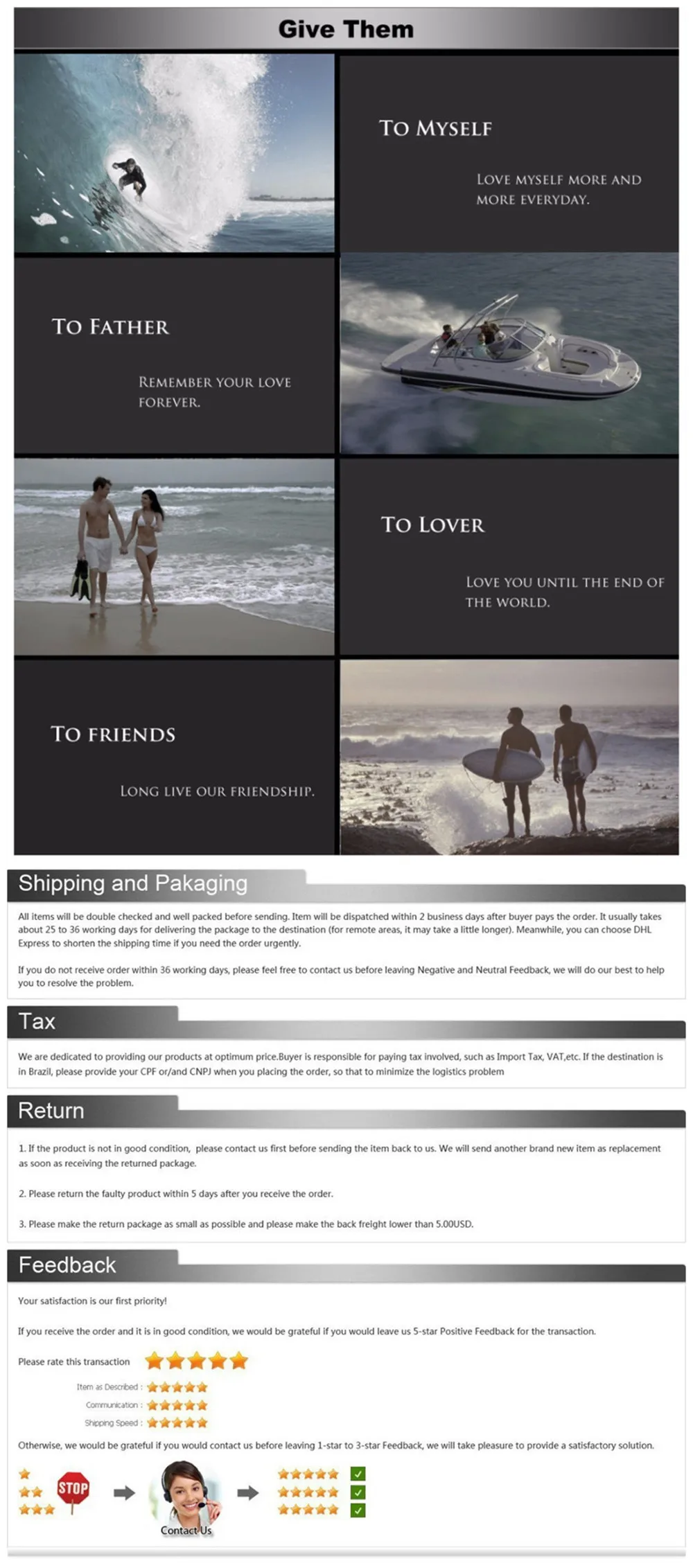 ДоставкаСрок доставки составляет около 7-60 рабочих дней. Доставка в некоторые страны может занять больше времени, особенно в Бразилию, Южную Америку, страны Африки.(1) Вопрос: Когда я совершу оплату, какое время может быть отправлено?О: отправка в течение 48 часов и предоставление номера трека.(2) В: как долго я получу посылку? Если не получили, как я могу сделать?О: согласно вашей стране, 7-60 дней. Более 60 дней не получено, мы вернем вам деньги.(3) Вопрос: Если у товара есть проблемы с качеством, как я могу сделать?О: пожалуйста, свяжитесь с нами, мы решим проблему.Если покупатели хотят узнать подробности о стоимости доставки, пожалуйста, свяжитесь с нами, и мы предоставим вам разумные варианты транспортировки.ГарантияЕсли товар поврежден качеством, мы предоставляем 2 года гарантии.Если покупателям необходимо сделать возврат, пожалуйста, обсудите с нами программу возврата.Независимо от того, у покупателей есть какие-либо проблемы, пожалуйста, свяжитесь с нами в любое время.Мы принимаем хорошие советы покупателей и стремимся обеспечить лучший опыт покупок.Мы постоянно даем покупателям льготную выгодную цену, внимательные приветствия, Сюрприз подарок.ОтзывыВсе отзывы-это любовь.(A) если вы удовлетворены своей покупкой, мы искренне надеемся, что вы оставите нам положительный отзывы.Кроме того, мы оставим вам положительные отзывы.(B) Если вы не удовлетворены своей покупкой, пожалуйста, свяжитесь с нами, прежде чем оставлять нейтральные или негативные отзывы.Мы свяжемся с Вами в течение 24 часов, работаем с вами, пока вы не будете удовлетворены.