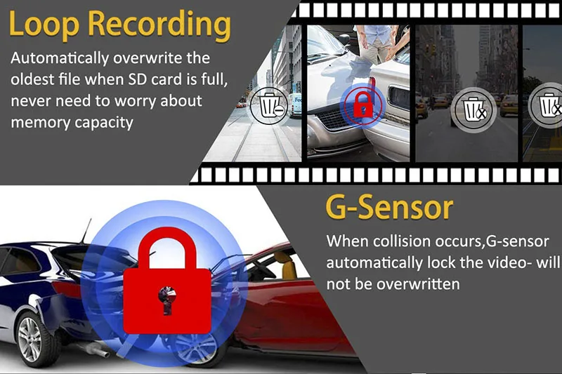 Наша автомобильная камера имеет функцию циклической записи, она автоматически перезаписывает предыдущие записи с новыми файлами, за исключением заблокированных файлов, когда карта памяти заполнена. Если вы хотите использовать циклическую запись и функцию g-датчика одновременно, вам нужно настроить датчик удара на «низкий».