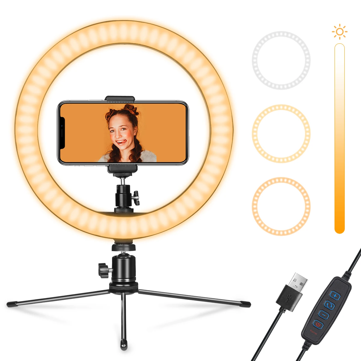 3 светильник режимы 10 "кольцевой светильник Светодиодное кольцо светильник с 3 светильник режимов и 10 регулируемой яркостью для вашего выбора, удовлетворить все ваши потребности в различных условиях. 3 светильник режима: белый, теплый желтый, теплый желтый + белый.
