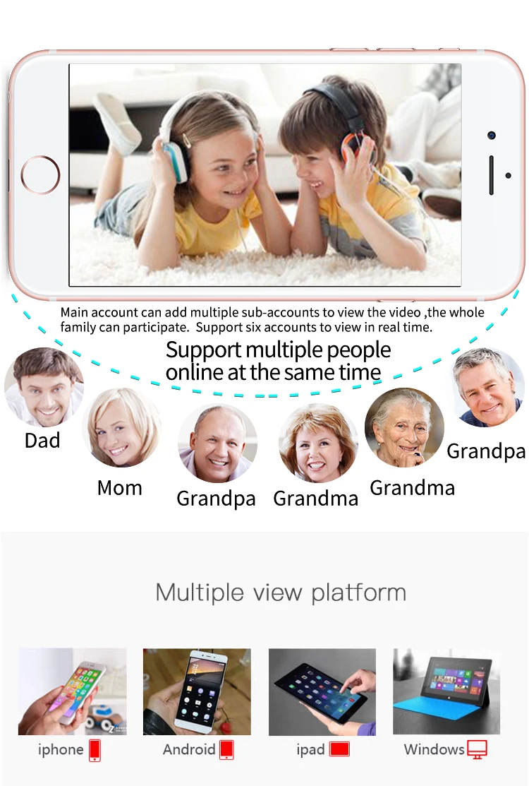 ● Основная учетная запись может добавить несколько подучетных записей для просмотра видео, вся семья может принять участие ● Поддержка шести учетных записей для просмотра в режиме реального времени
