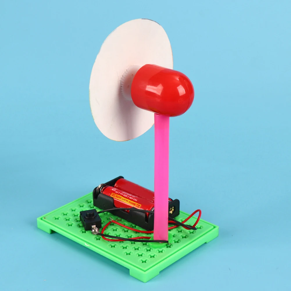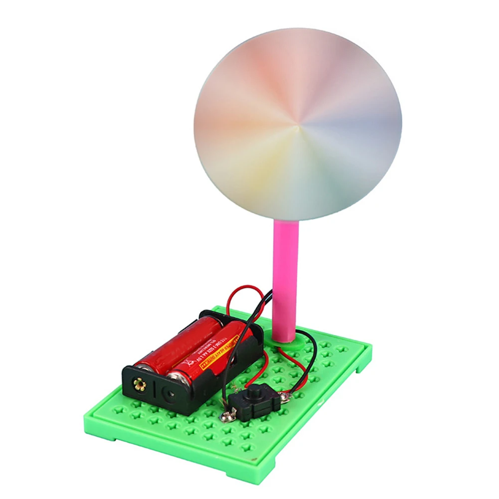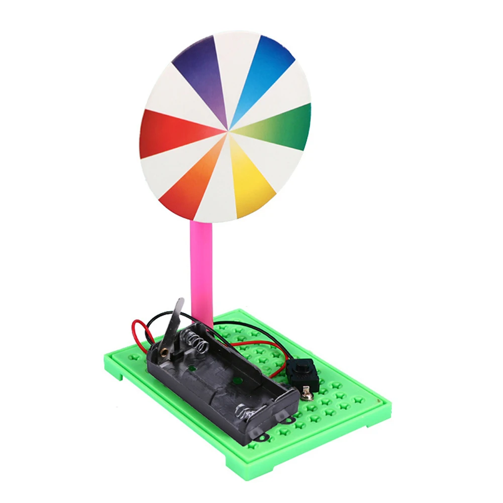 4. Измените пропорцию семи цветов, поместите его на жесткий бумажный диск после слегка закрепления, включите переключатель электрического вентилятора для регулировки скорости вращения, какие изменения вы видите? Почему цвет меняется при вращении?