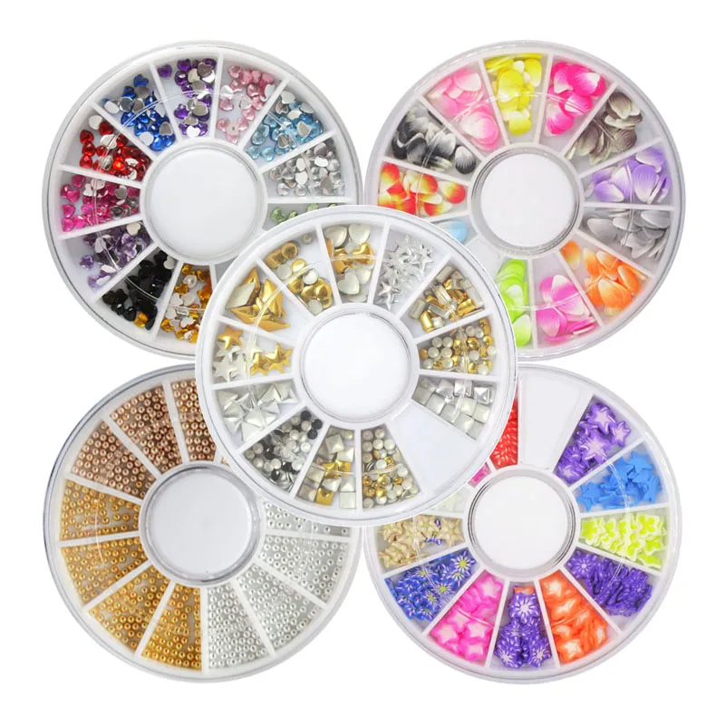 Инструменты для украшения ногтей: Есть много отличий в дизайне и цветах, включая цветок fimo, металлические шпильки, круглые жемчужные и акриловые стразы и т. д.