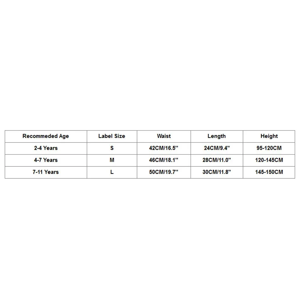 Рекомендуемый возраст Размер этикетки Талия Длина Высота 2-4 года S 42 см/16,5 дюйма 24 см/9,4 дюйма 95-120 см 4-7 лет М 46 см/18,1'' 28 см/11,0" 120-145 см От 7 до 11 лет L 50 см/19,7'' 30 см/11,8" 145-150 см