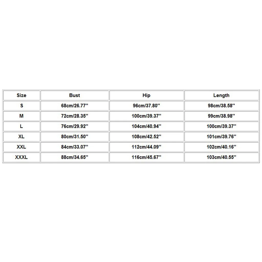 Size Bust Hip Length S 68cm/26.77'' 96cm/37.80'' 98cm/38.58'' M 72cm/28.35'' 100cm/39.37'' 99cm/38.98'' L 76cm/29.92'' 104cm/40.94'' 100cm/39.37'' XL 80cm/31.50'' 108cm/42.52'' 101cm/39.76'' XXL 84cm/33.07'' 112cm/44.09'' 102cm/40.16'' XXXL 88cm/34.65'' 116cm/45.67'' 103cm/40.55''