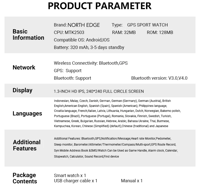 1. GPS/GPS Route Record 2. Heart Rate/Sleep monitor 3. Altimeter, Barometer, Compass 4. Pedometer, Stopwatch, Timer, Calories 5. Multi-sport: Hiking/Hiking/Cycling/Marathon 6. Alarm clock 7. Calendar 8. Calculator 10. Find device 11. Call Mind, Message Mind, Answer Call