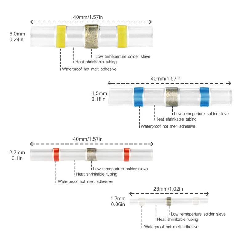 ------ Предоставить вам квалифицированные терминалы и удовлетворить ваши потребности в различных проектов электропроводки, независимо от того, работаете ли вы на своей лодке, транспортном средстве, дома или Научном проекте, наши Термоусадочные соединители для припоя и уплотнения обеспечат плотную пайку, увеличенный поток тока и всепогодные соединения каждый раз ~ Особенности: ● Коэффициент усадки 2:1 ● легкие одношаговые Проводные соединения. ● Простая Идентификация: цветная соединительная трубка. ● Полиолефиновые термоусадочные стыковые соединители улучшают прочность вытяжки. ● Высококачественные провода разъемы в уплотнение, сброс напряжения, проверка кабеля и изоляция. ● Плавленный припой обеспечивает прочное соединение проводов и позволяет избежать выскальзывания проводов из терминала. ● Соблюдайте все соответствующие стандарты: ROHS, ISO 9001:2008, SGS и CE. Посылка включает в себя: ● 1X50/100/150/200/250/300/500 шт термоусадочные Паяные соединители (четыре размера/цвета)