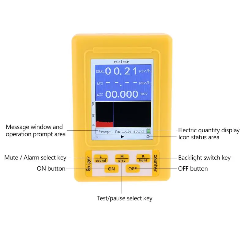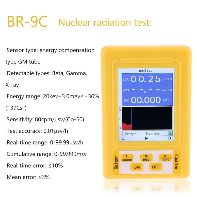 Характеристики: большой экран облегчает чтение данных, и кнопки просты в эксплуатации. Корпус изготовлен из высококачественного АБС-пластика, который обладает высокой термостойкостью и холодным сопротивлением, высокой прочностью и тонкой прочностью. Высокая чувствительность, широкий диапазон измерений, имеет длительный срок службы. Электромагнитное излучение и атомное излучение могут быть обнаружены. Он может удовлетворить потребности в домашнем обнаружении жизни, обнаружении подстанций, обнаружении башни мобильного сигнала и т. д. Он также может быть применен для проверки материала, экологического теста, радиологической защиты, радиофармацевтического скрининга и т. Д. С выключением звука, будильником, кнопкой выбора звука частиц, тестом, значением сброса значений, кнопкой выбора Подсветку можно включить или выключить. Технические характеристики: Материал: АБС-пластик, Цвет: Модель: BR-9C Экран Размер: 57*43 мм/2,2 * 1.7in электромагнитного излучения Тесты: Тесты диапазон: Мощность Плотность: 0-99.999μw/c㎡ напряженность электрического поля: 0-999,99/м магнитного поля интенсивность: 0-99.999μT Тесты точность: Мощность Плотность: 0,001 мкВт/c㎡ напряженность электрического поля: 0,01/м магнитного поля интенсивность: Диапазон частот 0001 мкм: плотность мощности: 50 МГц-5 ГГц интенсивность электрического поля: 20 Гц-100 МГц интенсивность магнитного поля: 20 Гц-1 МГц тест на атомное излучение: Тип датчика: тип компенсации энергии GM Тип трубки обнаруживаемые типы: бета, гамма, рентгеновский диапазон энергии: 20kev ~ 3.0mev ≤ ± 30%(137Cs-) Чувствительность: 80cpm/μsv/(Co-60) Точность теста: 0,01/ч h в режиме реального времени диапазон: 0-99.99μsv/ч накопленный диапазон: 0-99.999msv в режиме реального времени ошибка: ≤ 10% означает, что ошибка: ≤ 3% Батарея: 3 * AA (не включены) 1,5 V Батарея или 3*1,2 V аккумуляторная Батарея шт.) (не входят в комплект поставки) индикация во время зарядки: USB 5V 2A полный заряд Power Bank: ≥ 4 часов Габариты изделия: 105*70*30 мм/4,1*2,8 * 1.2in Вес товара: 105 г/3,7 унция посылка Размер: 150*100*55 мм/5,9*3,9 * 2.2in посылка Вес: 169 г/6,0 унций Примечание: в тех случаях, когда вам конвертировать в режиме вам нужно выключить устройство и повторно войти на страницу выбора. Посылка: 1 * Детектор 1 * Руководство пользователя