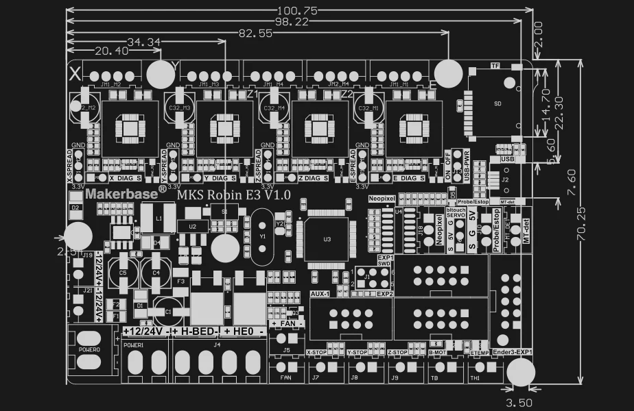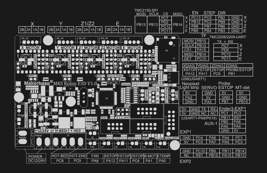 Материнская плата MKS Robin E3-это экономичная материнская плата 3d принтера, разработанная makerbase, специально подходящая для creality Ender-3, Ender-5 и CR-10 принтера для обновления. MKS Robin E3 интегрирует четыре tmc2209,MKS Robin E3D может изменить драйвер.