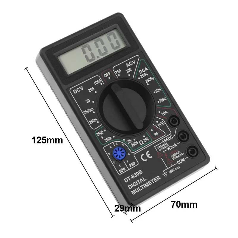 Особенности: 3 1/2 цифр, 7 сегментов, 0,5 "высокий ЖК-дисплей. Без зуммера. Макс. Дисплей: 1999, Автоматическое Отображение полярности. Маленький и компактный дизайн. Защита от перегрузки на всех диапазонах. Пробоотборник 2-3 раза в секунду. Тест диода в сборе/Тест температуры/Тест транзистора hFE. Индикация низкого напряжения батареи. Размер: 125x70x29 мм, легкий вес Мощность: 20 МВт Максимальный ток переменного тока: 10 А Максимальный диапазон напряжения постоянного тока: 1000 в Максимальный диапазон напряжения переменного тока: 750 В Измерение сопротивления: Диапазон 200 Ohm-2000K Ом Индикатор низкой мощности Защита от перегрузки Источник питания: 9V 6F22 батарея (9V батарея не входит в комплект поставки) Цвет: как показано на фото Содержимое упаковки: Цифровой мультиметр DT830B (батарея не входит в комплект)-1 шт. 1 х тестовых проводов Руководство пользователя (1 шт.) Примечание: Этот товар без розничной коробки. Мультиметр и тестовый свинец могут немного отличаться из-за разного производства, они будут отправлены случайным образом, пожалуйста, поймите, спасибо!