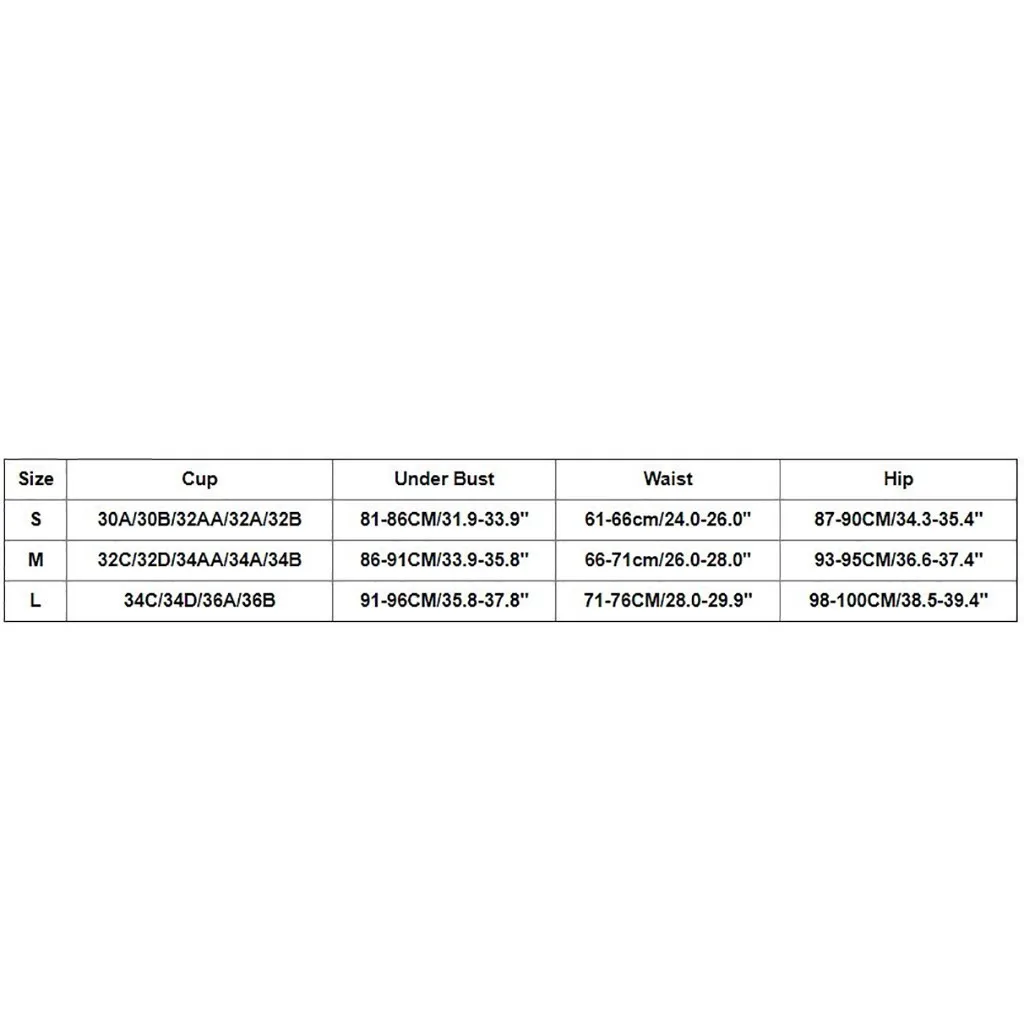 Примечание: Пожалуйста, сравните детали размеров с вашими перед покупкой! Используйте аналогичную одежду, чтобы сравнить с размеромРазмеры Чашка Обхват под грудью Обхват талии Обхват бедер S 30A/30B/32AA/32A/32B 81-86 см/31,9-33,9" 61-66 см/24,0-26,0" 87-90 см/34,3-35,4" М 32C/32D/34AA/34A/34B 86-91 см/33,9-35,8" 66-71 см/26,0-28,0" 93-95 см/36,6-37,4" L 34C/34D/36A/36B 91-96 см/35,8-37,8" 71-76 см/28,0-29,9" 98-100 см/38,5-39,4"