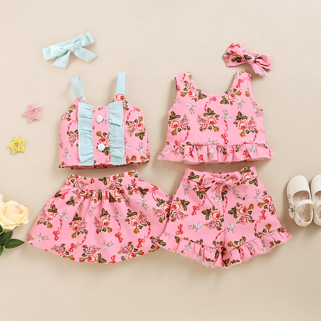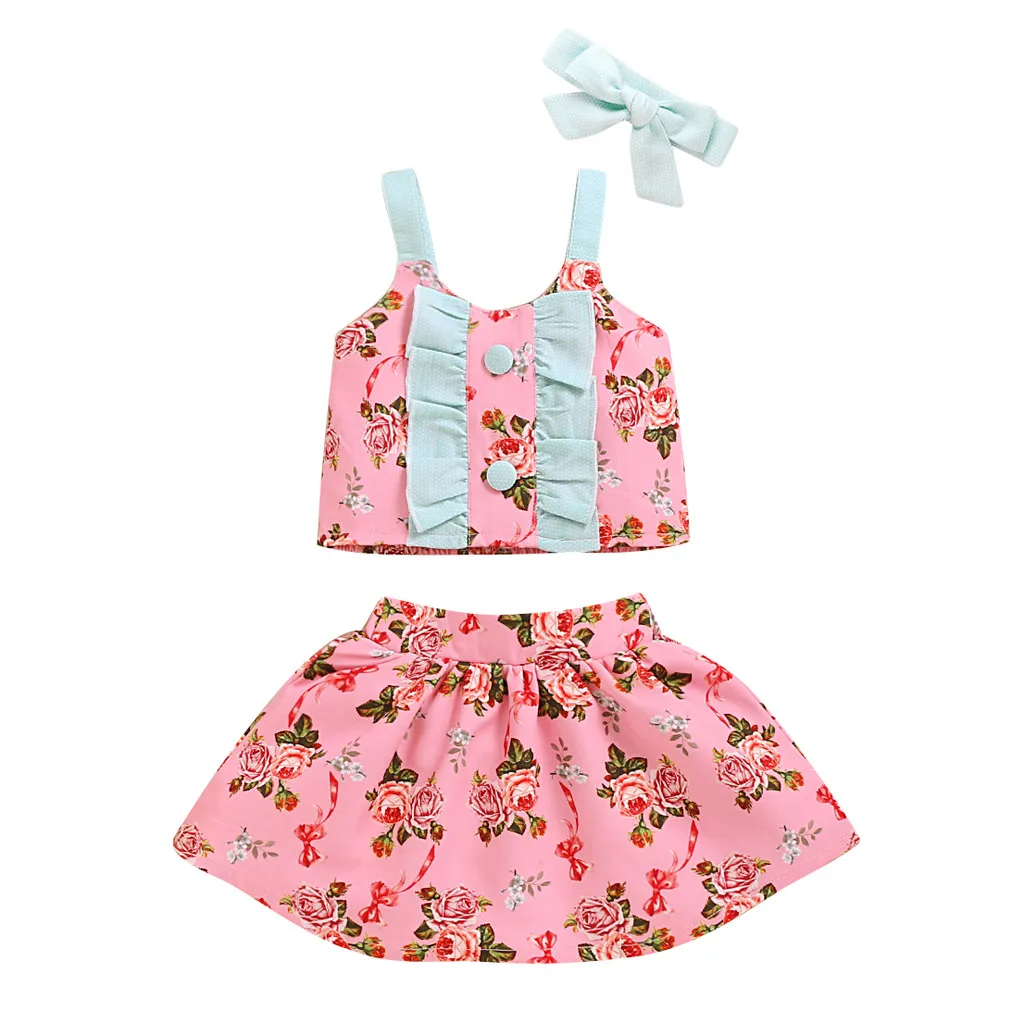 Комплект одежды из 3 предметов для маленьких девочек, жилет с цветочным принтом для малышей, топы, юбка, наряды