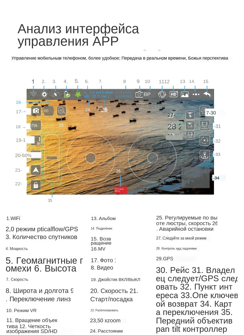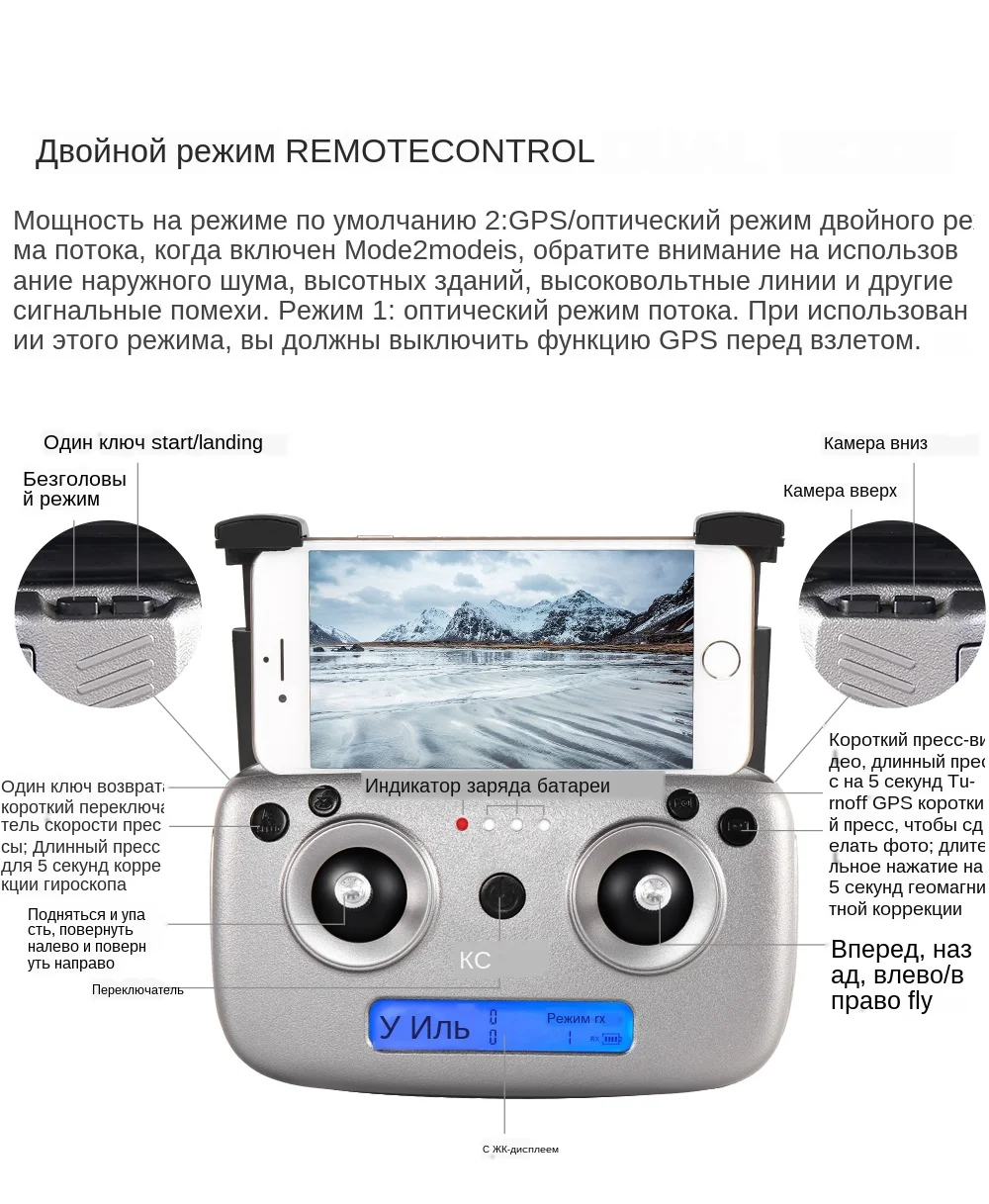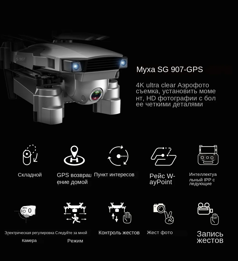Gps возвращается в точку взлета с помощью одной кнопки, и низкая мощность возвращается в воздух, и нет сигнала для возврата. Gps Smart Follow: после того, как самолет свяжется с gps, функция отслеживания приложения включена, и самолет следует за мобильным телефоном. Изображение: 1-5 м от самолета, чтобы определить предмет и выполнить автоматический контроль полета. Распознавание Жестов: в пределах 1-5 м от самолета, сделайте жестом камеры/жестом камеры к камере. Многоточечное планировочное полёт трассы: самолет автономно летает в соответствии с заданным маршрутом, а игрок концентрируется на стрельбе. Spot Surround: Найдите центр вокруг и переместите нужный радиус окружности с помощью джойстика. Функция восстановления самолета: непрерывно нажимайте значок gps-сигнала 3 раза, чтобы открыть интерфейс карты, карта показывает конечное расстояние самолета, широту и долготу положения. Характеристики MV: фильтры, видеоэффекты, фоновая музыка, обмен фото/видео Технические характеристики изделия: Объектив камеры: 120 ° Регулируемый угол наклона камеры: 90 ° Время полета: около 18 мин Время зарядки: около 4 часов Расстояние управления (свободные помехи и отсутствие окклюзии): 500 м Расстояние передачи изображения Wi-Fi (без помех и без окклюзии): 300 м Gps Следуйте за мной: 30 м Изображение: 1-5 м Фокусное расстояние: 50x зум Съемка жестов рук/видео-рекогносцирование: 1-5 м 1080P версия Разрешение видео 1080 P: 1920x1080 P Разрешение фото 1080 P: 1920x1080 P Камера заднего вида: 1280*720p 4K версия Разрешение видео 4 K: 2048x1080 Разрешение фото 4 K: 4096*3072P Камера заднего вида: 1280*720p Частота кадров: 25 кадров в секунду Емкость умной литиевой батареи: 7,4 В 1600 мАч Фиксированная точка объемного Противоударная аэрофотосъемки Фото/видео поделиться Двойной режим gps/ГЛОНАСС Посылка включает в себя: 1 х Квадрокоптер 1 x usb-кабель для зарядки 1 х пульт дистанционного управления 1 х Отвертка 4 х лезвия 1 х 7,4 В 1600 мАч литий-полимерный аккумулятор Руководство пользователя-1 шт.;