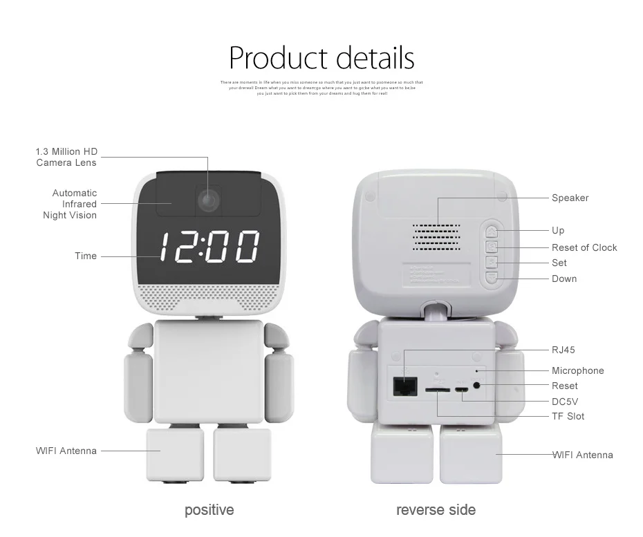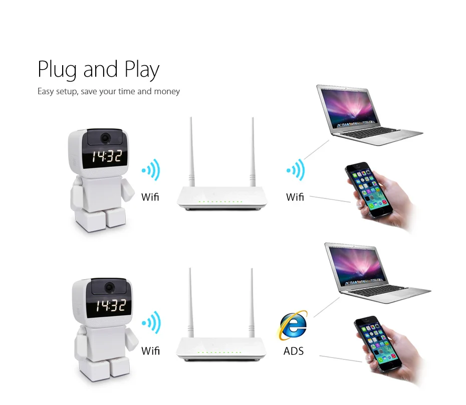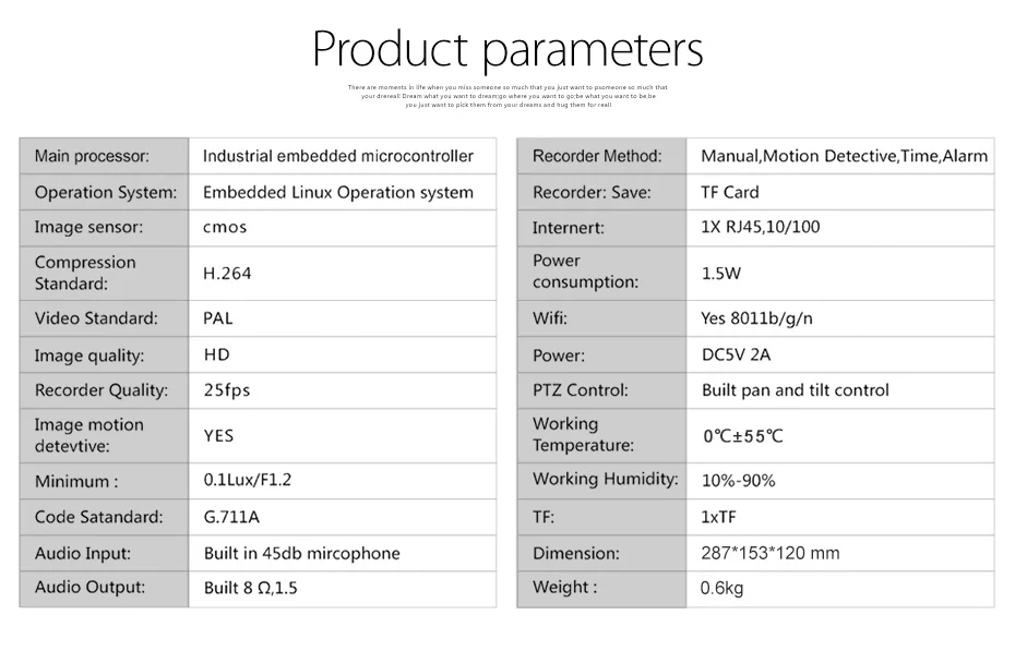 Датчик Датчик H42 1/4 дюйма CMOS сенсор Пиксели 1280 × 960(1.0MP) Минимальная освещенность 0,01 Объектив Объектив/угол обзора 3,6 мм Угол обзора 60 ° Автоматический переключатель фильтра ночного видения с двумя IR-CUT ИК Расстояние 8 м Подключение Сетевой протокол HTTP,FTP,TCP/IP,UDP,SMTP DHCP,PPPoE,DDNS,UPnP,RTSP Поддержка проводной сети WIFI(IEEE?802.11b/g/n) Беспроводное подключение SmartLink connect Поддержка onvif, RTSP Поддержка P2P Сеть Формат сжатия H.264,MJPEG Разрешение 960P(VGA) Частота кадров 25 кадров в секунду Двойной поток кода Поддержка мультимедиа Поддержка обнаружения движения Поддержка сигнализации электронной почты/FTP P/T панорама: 355 °, наклон: 45 ° Запись 24-час петли Запись. Предустановленная Поддержка положения 8 Настройка кнопки отображения часов Поддержка звуковой сигнализации Хранение Локальное хранилище поддерживает до 64 Гб MicroSD карты; NVR;PC Поддержка встроенного аудио микрофона Формат сжатия Adpcm Внутренний динамик 8R2W