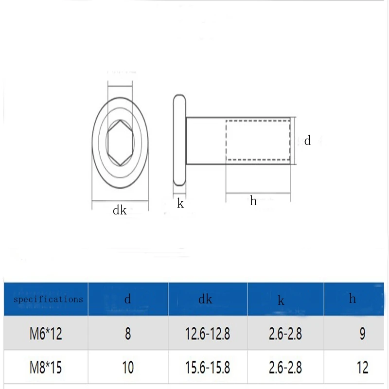 Dk: head diameter K: head thickness L: thread length D: thread diameter This data is a single batch of manual measurement, there is error, please take the actual object as the standard!