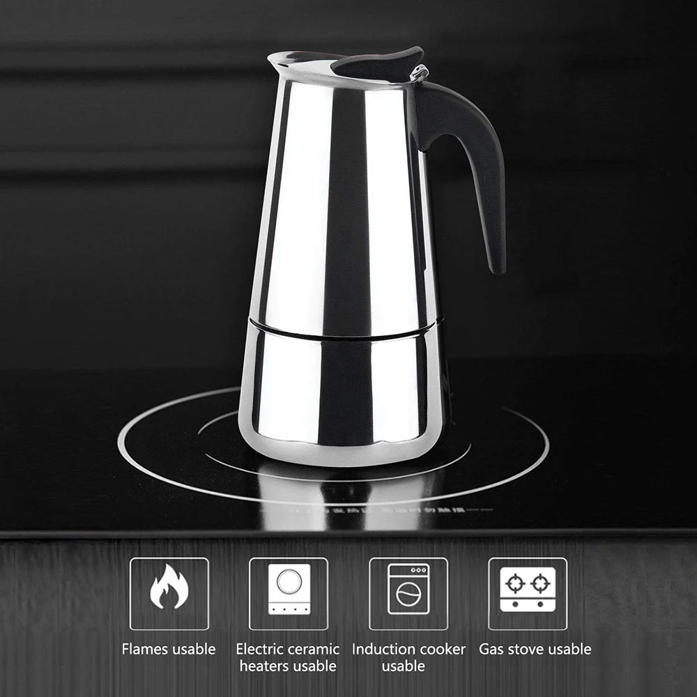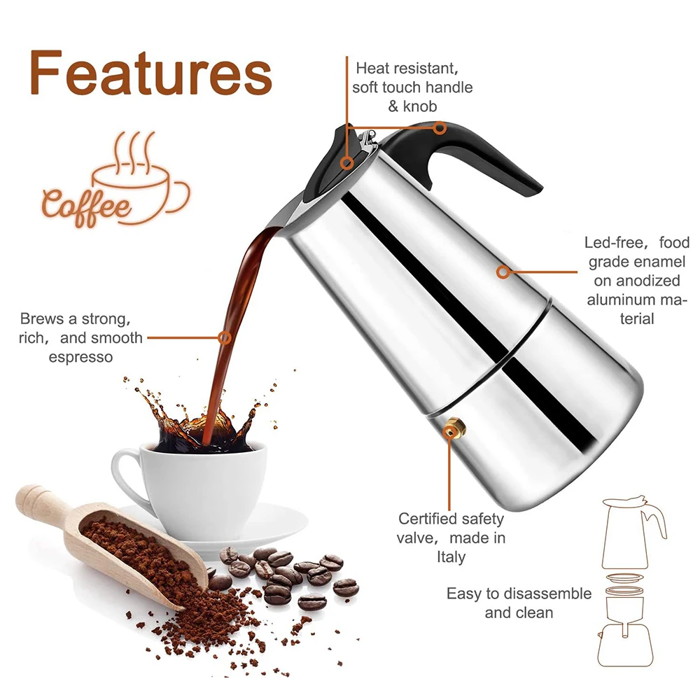 1. С дизайном фильтра из нержавеющей стали, тонкой фильтрации, без запаха и нетоксичный, не легко деформируется, длительный срок службы. 2. Изготовлен из нержавеющей стали, коррозии и коррозии, водонепроницаемый и влагостойкий, прочный и долговечный в использовании. 3,100/200/300/450/600 мл емкость доступные, серебро, внешний вид, стильный и элегантный, шикарный и очаровательный, подходящие для клиентов различные потребности. 4. С дизайном предохранительного клапана, который может выпустить давление во время, когда это чрезмерное внутреннее давление, надежное в использовании. 5. Утолщенный Нижний Дизайн, износостойкость, его можно нагревать газовой плитой, спиртовой лампой, газовой плитой, индукционной плитой и т. д. практичный и портативный.