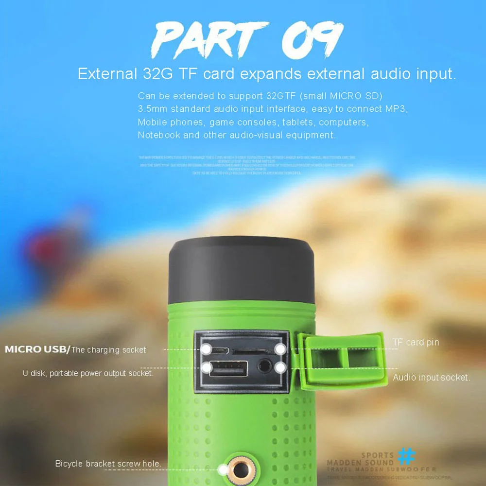 Беспроводной BT аудио, наружное использование, водонепроницаемый, пыленепроницаемый и ударопрочный, басовый звук, встроенная большая емкость батареи, может использоваться в качестве банка питания для зарядки мобильных телефонов, со светодиодными лампами, различные режимы освещения, безопасное использование на открытом воздухе. Шокирующие звуковые эффекты, вы также можете наслаждаться музыкой на открытом воздухе.