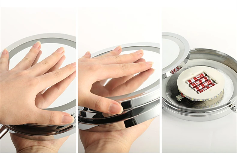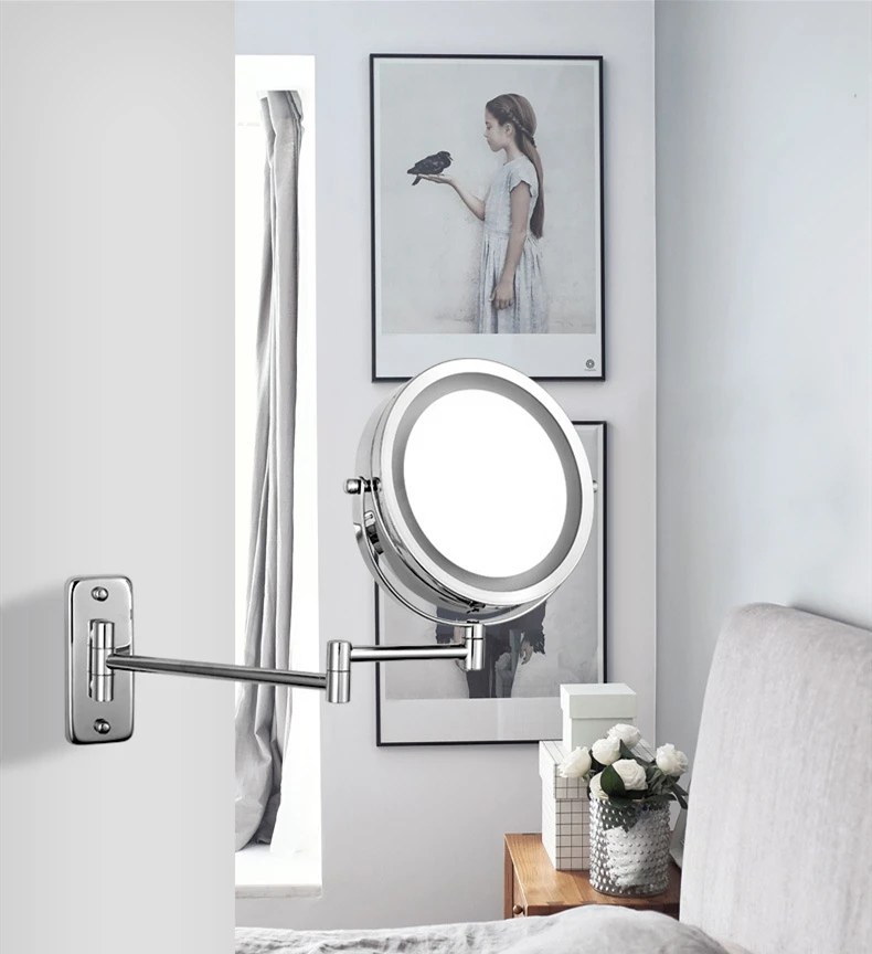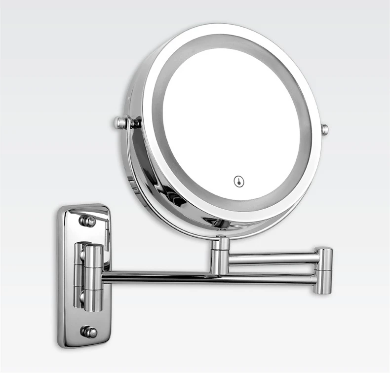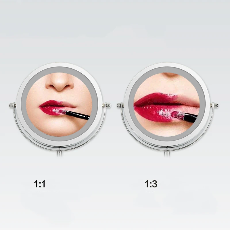 Он содержит светодиодные лампы для близкого бритья или макияжа. Зеркало имеет две стороны, одна сторона является стандартным кратным, а другая сторона является 3-кратным увеличением, что очень удобно.