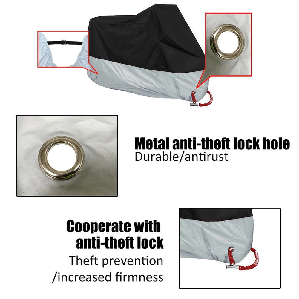 * 4.два специально спроектированных замочных отверстия на переднем кромке, которые обеспечивают замки для мотоциклов, предотвращают кражу и сохраняют безопасность мотоцикла в ветреные дни. Идеально подходит для наружного хранения мотоциклов, эти 2 отверстия для замка позволяют удобно блокировать мотоцикл с замки для мотоциклов (не входят в комплект)