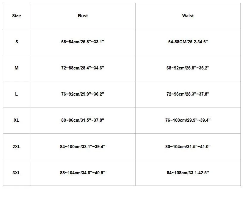Размеры Бюст Талия S 68 ~ 84 см/26,8 ~ 33,1 дюйма 64-88 см/25,2-34,6" М 72 ~ 88 см/28,4 ~ 34,6 дюйма 68 ~ 92 см/26,8 ~ 36,2 дюйма L 76 ~ 92 см/29,9 ~ 36,2 дюйма 72 ~ 96 см/28,3 ~ 37,8 дюйма XL 80 ~ 96 см/31,5 ~ 37,8 дюйма 76 ~ 100 см/29,9 ~ 39,4 дюйма 2XL 84 ~ 100 см/33,1 ~ 39,4 дюйма 80 ~ 104 см/31,5 ~ 41,0 дюйма 3XL 88 ~ 104 см/34,6 ~ 40,9 дюйма 84 ~ 108 см/33,1-42,5 дюйма