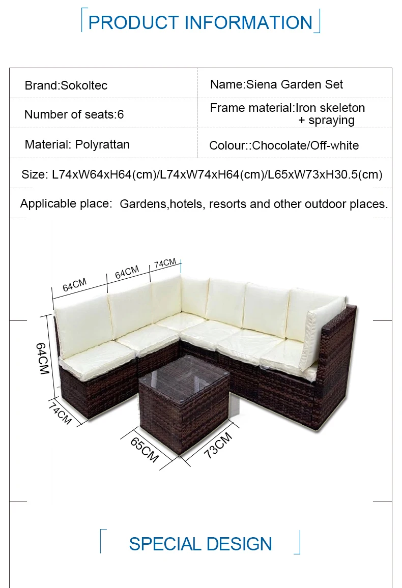 Цвет: Шоколадный Цвет сиденья: не совсем белый Материал:Polyrattan Материал рамы: железный каркас + напыление Материал чехла для подушки: отделка трубопроводов Количество посадочных мест:6 Толщина сиденья:8 см